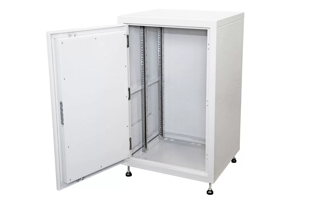Дверь шкафа усилена двумя швеллерами и запирается надежным ригельным замком с трехточечной фиксацией. Угол открывания двери – 120˚, обеспечивает хороший доступ для монтажа и коммутации оборудования.