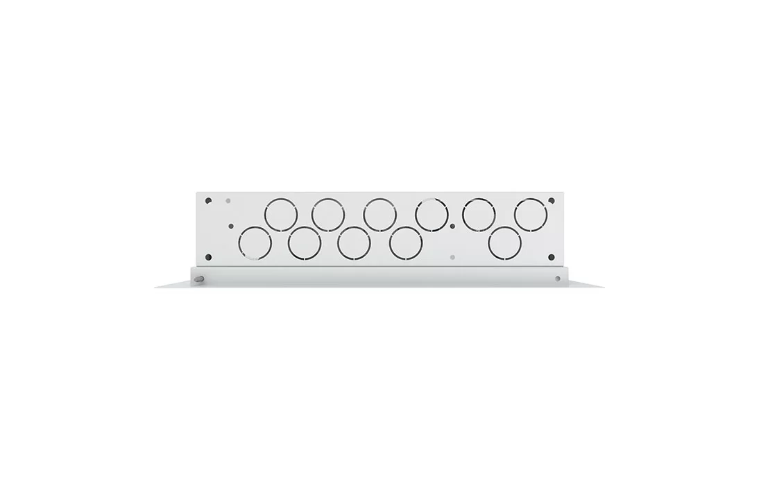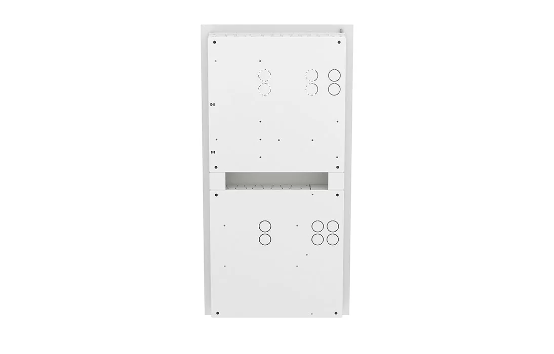 Двухсекционный корпус шкафа с четырёх сторон, а также на задней стенке имеет выламываемые кабельные вводы диаметром 36мм. В комплекте со шкафом поставляются 6 резиновых заглушек кабельного ввода.