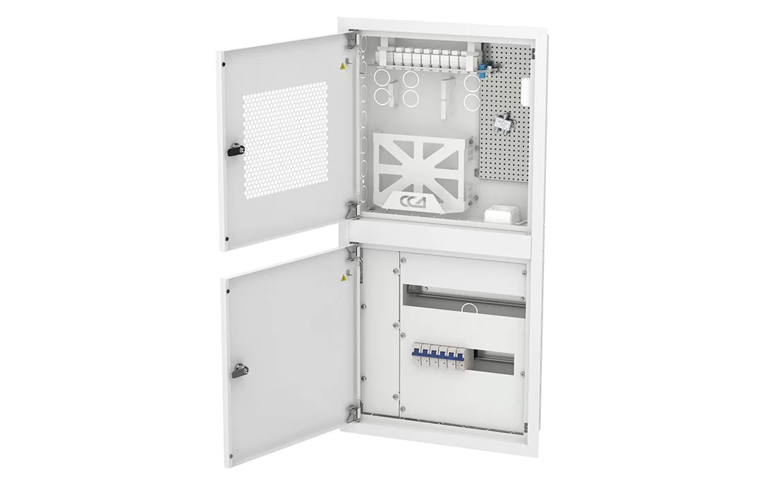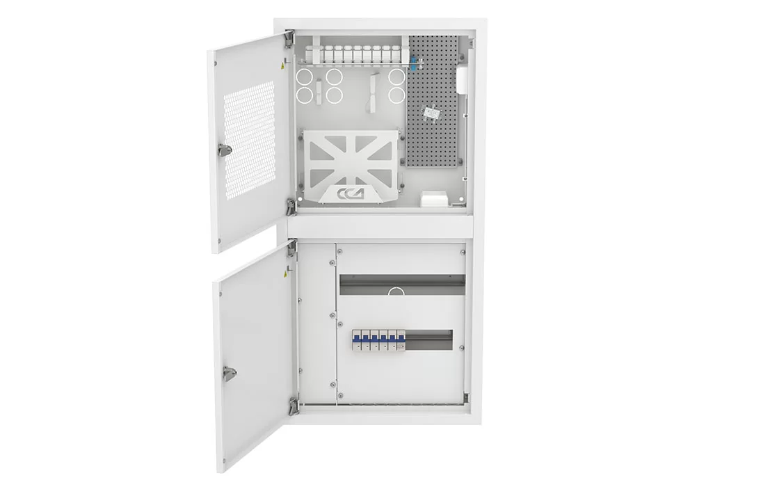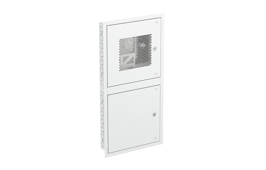 Шкаф квартирный телекоммуникационный встраиваемый двухсекционный представляет собой двухсекционный корпус и внешний лючок, состоящий из накладной рамки с двумя дверцами из стали толщиной 1,0 мм.
