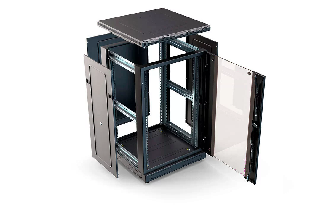 За счет элементов крепления каркас шкафа имеет повышенную жесткость. Распределенная вертикальная нагрузка до 800 кг. Стандартно шкаф комплектуется: передней дверью, боковыми и задней стенками с замками.