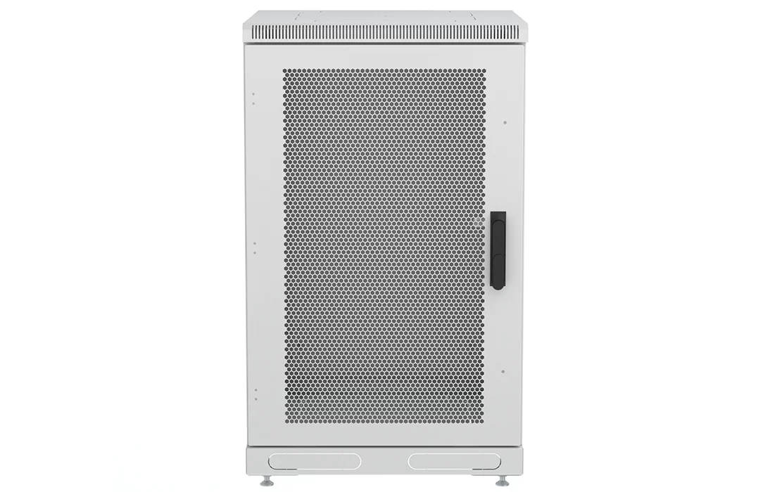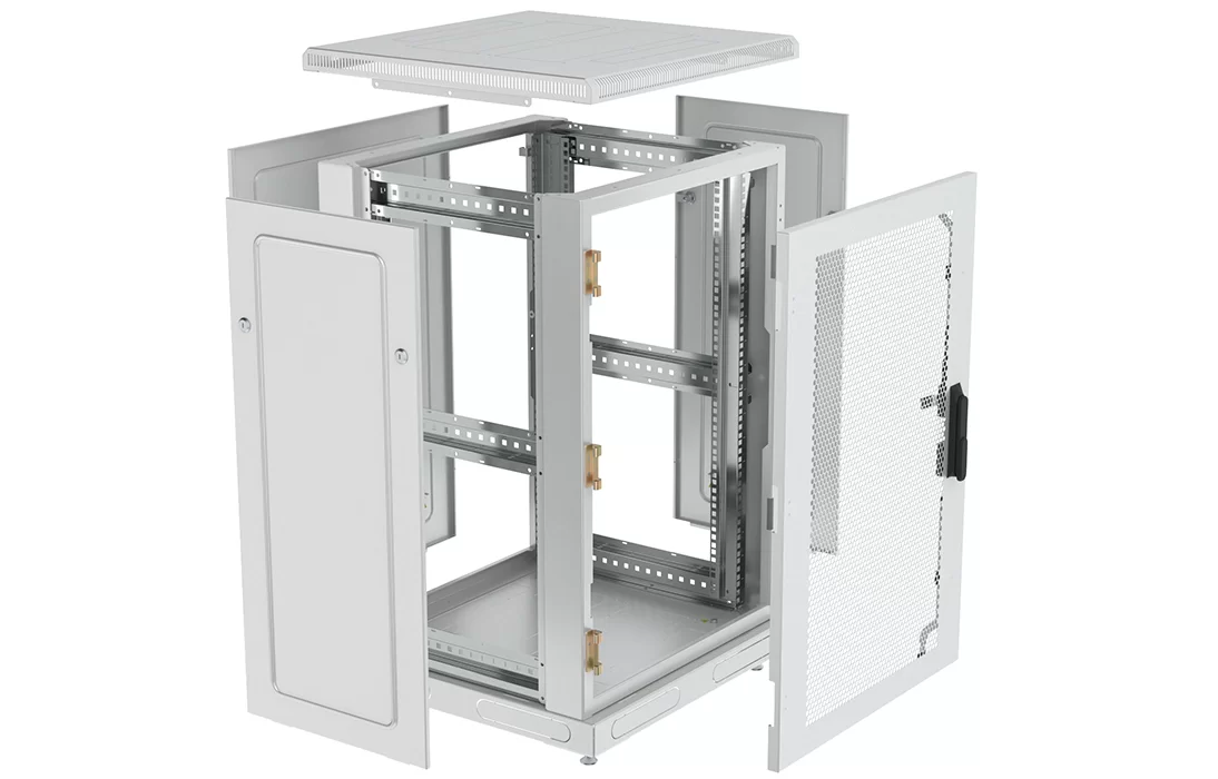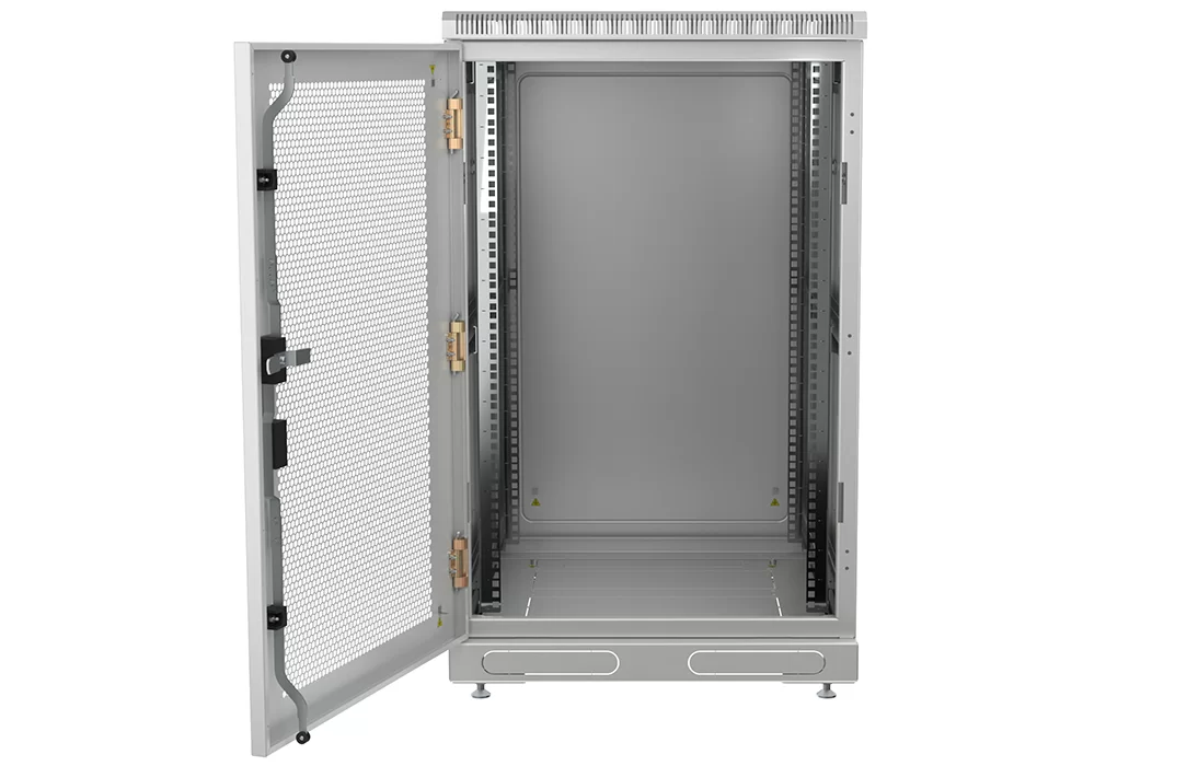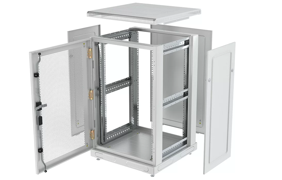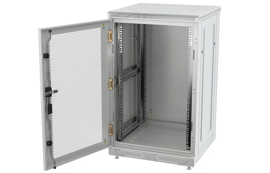 За счет элементов крепления каркас шкафа имеет повышенную жесткость. Распределенная вертикальная нагрузка до 600 кг. Стандартно шкаф комплектуется: передней дверью, боковыми и задней стенками с замками.
