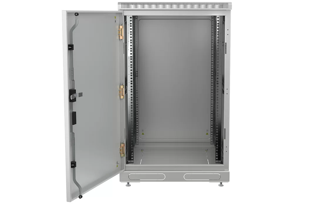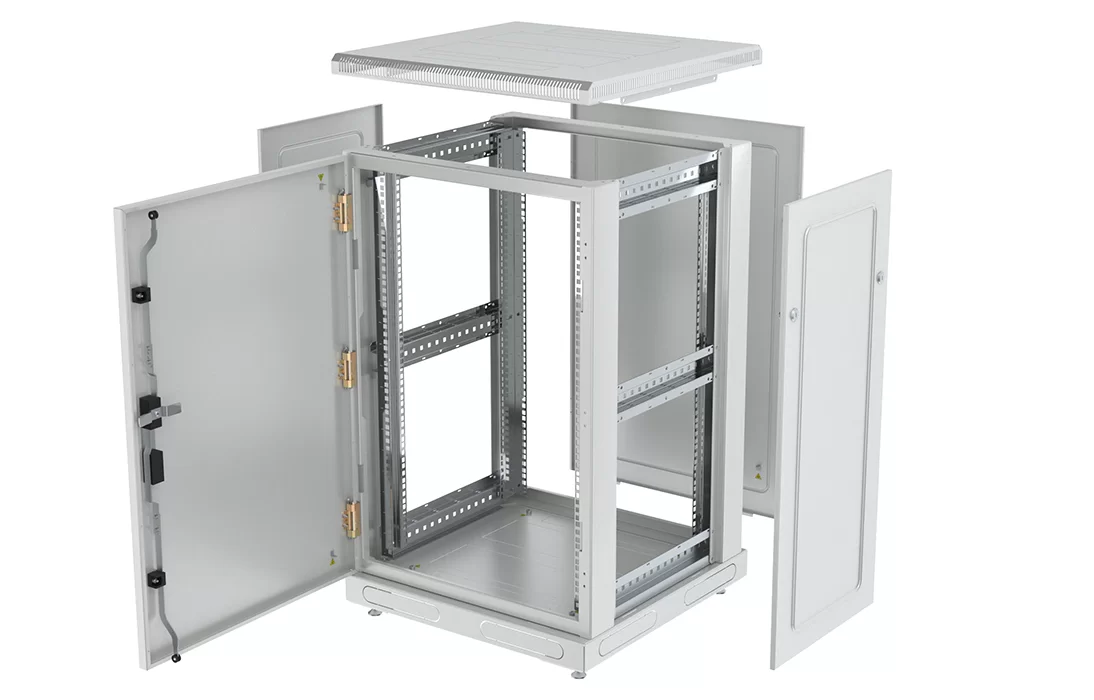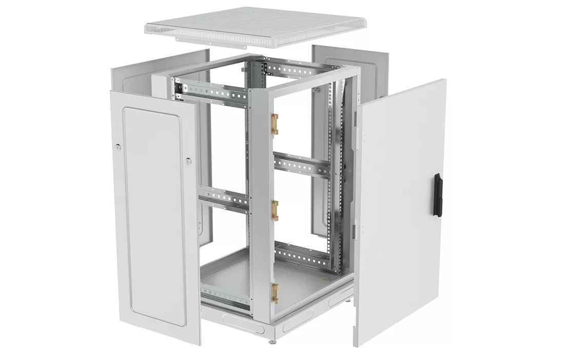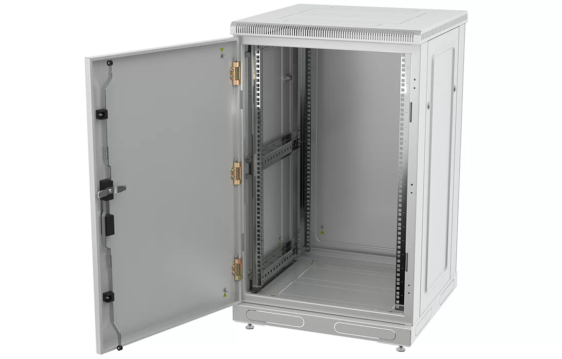 За счет элементов крепления каркас шкафа имеет повышенную жесткость. Распределенная вертикальная нагрузка до 600 кг. Стандартно шкаф комплектуется: передней дверью, боковыми и задней стенками с замками.