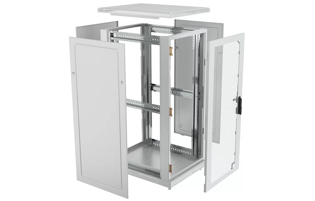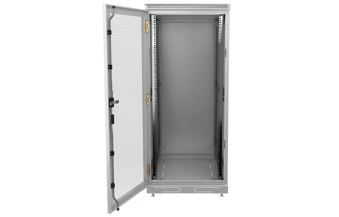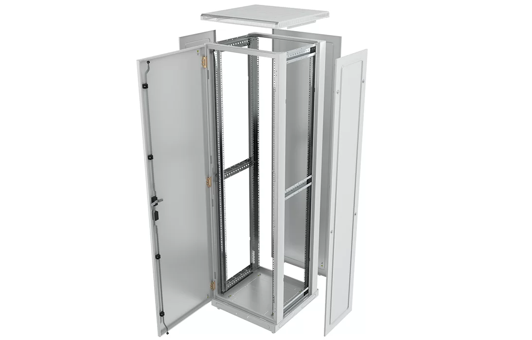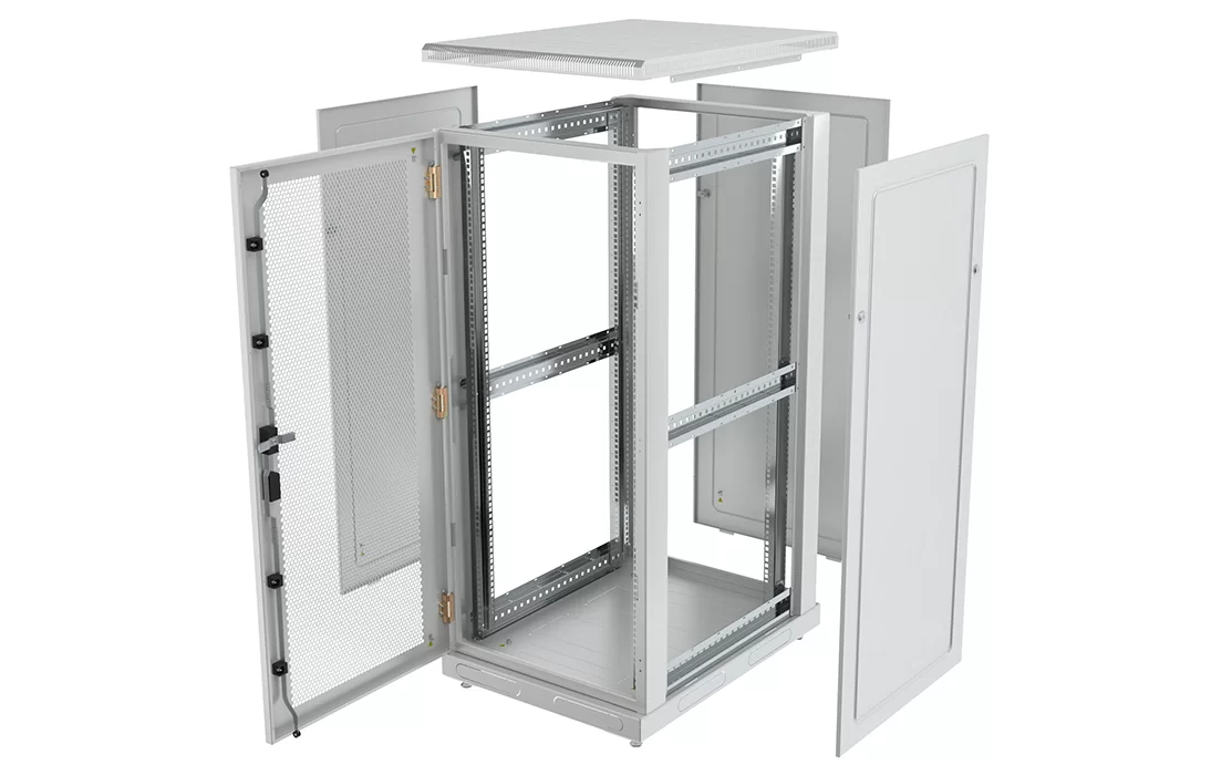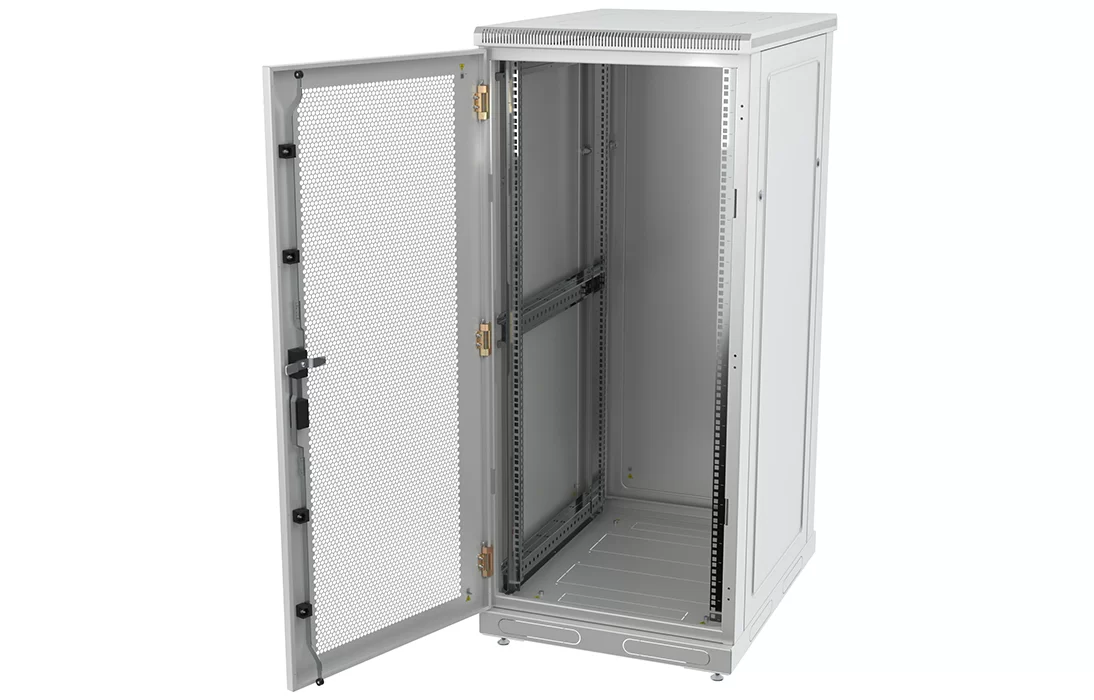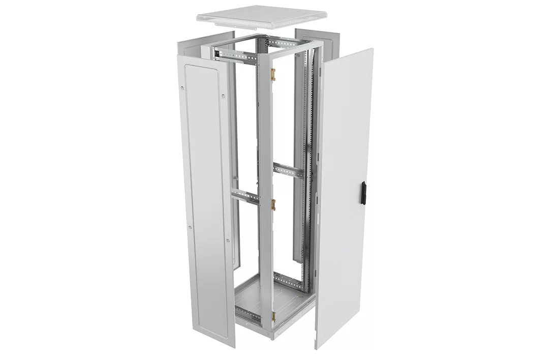 За счет элементов крепления каркас шкафа имеет повышенную жесткость. Распределенная вертикальная нагрузка до 600 кг. Стандартно шкаф комплектуется: передней дверью, боковыми и задней стенками с замками.