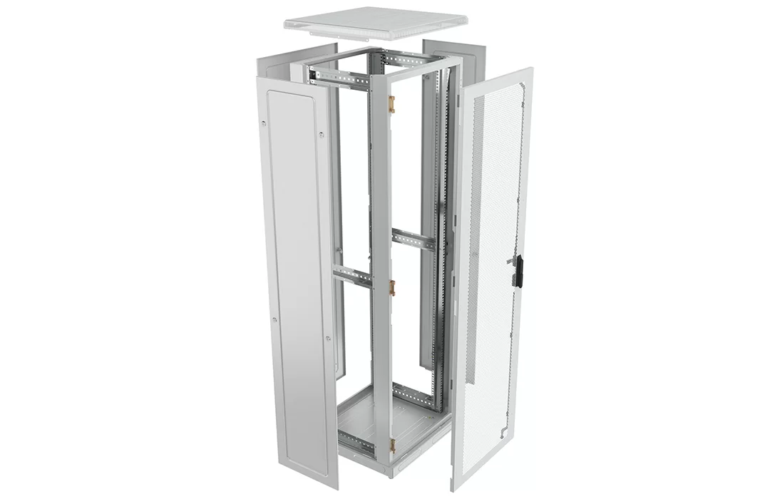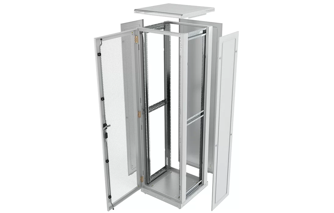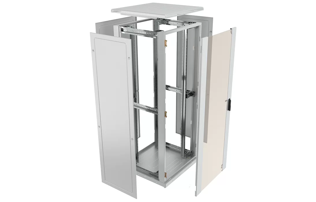 За счет элементов крепления каркас шкафа имеет повышенную жесткость. Распределенная вертикальная нагрузка до 600 кг. Стандартно шкаф комплектуется: передней дверью, боковыми и задней стенками с замками.