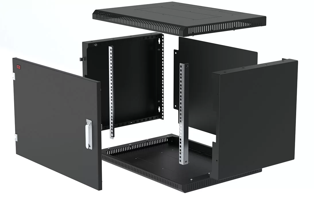 Имеет полностью разборную конструкцию и состоит из шести основных частей: крыша, дно, две боковые стенки с вертикальными направляющими, дверь, задняя стенка* и две передние направляющие. За счет элементов крепления каркас шкафа имеет повышенную жесткость. Комплектация шкафа возможна с несколькими исполнениями двери-металлической, перфорированной и с каленым ударопрочным, тонированным стеклом. Предусмотрены два кабельных ввода в верхней и нижней частях шкафа, размер – 100х50 мм. В основание или крышу шкафа возможна установка вентиляторного модуля. Для установки модуля демонтируется заглушка, и модуль фиксируется шестью винтами. Вертикальные направляющие регулируются по глубине. Система заземления и задняя стенка входит в стандартную комплектацию.