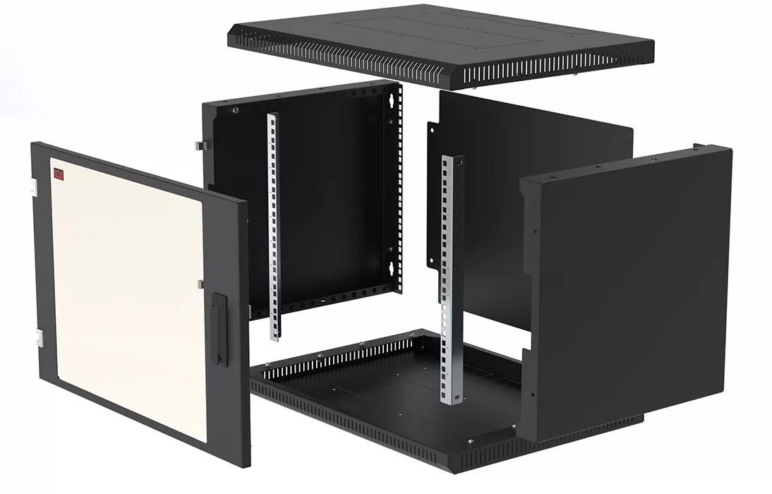 Имеет полностью разборную конструкцию и состоит из шести основных частей: крыша, дно, две боковые стенки с вертикальными направляющими, дверь, задняя стенка* и две передние направляющие. За счет элементов крепления каркас шкафа имеет повышенную жесткость. Комплектация шкафа возможна с несколькими исполнениями двери-металлической, перфорированной и с каленым ударопрочным, тонированным стеклом. Предусмотрены два кабельных ввода в верхней и нижней частях шкафа, размер – 100х50 мм. В основание или крышу шкафа возможна установка вентиляторного модуля. Для установки модуля демонтируется заглушка, и модуль фиксируется шестью винтами. Вертикальные направляющие регулируются по глубине. Система заземления и задняя стенка входит в стандартную комплектацию.