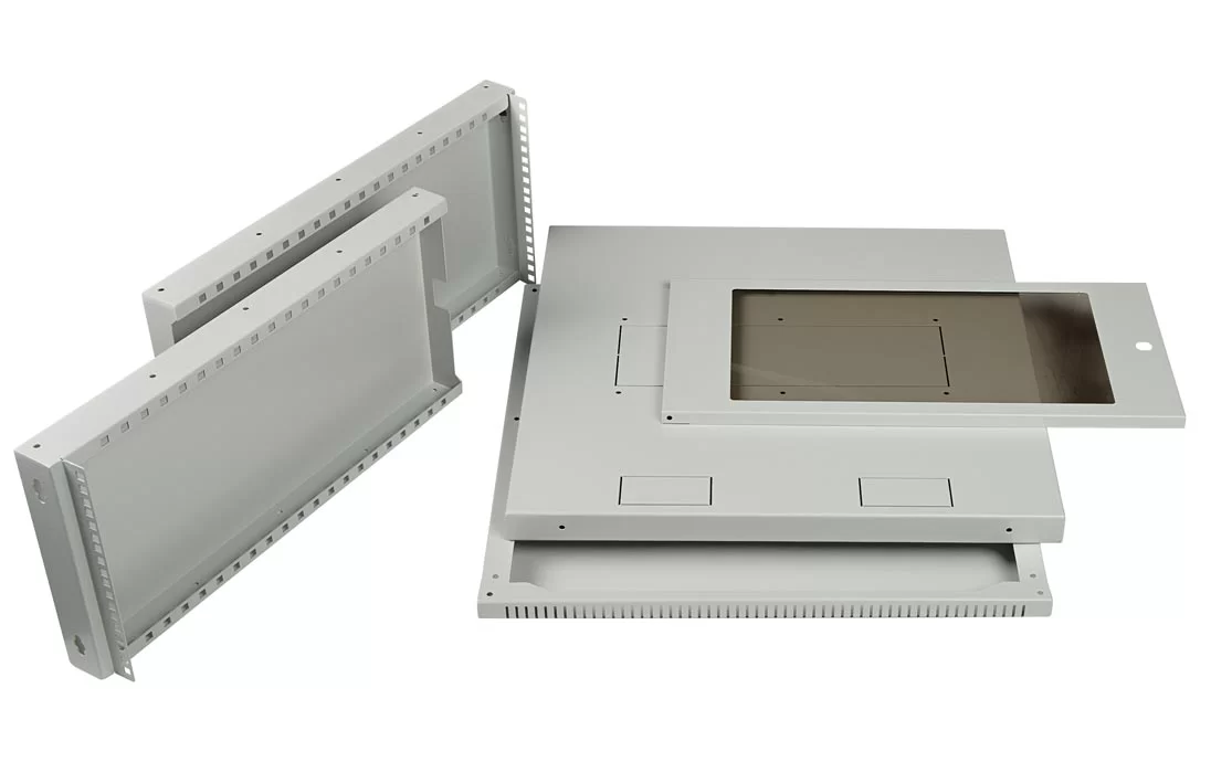 Имеет полностью разборную конструкцию и состоит из шести основных частей: крыша, дно, две съемные боковые стенки с вертикальными направляющими, дверь, задняя стенка* и две передние направляющие. За счет элементов крепления каркас шкафа имеет повышенную жесткость. Комплектация шкафа возможна с несколькими исполнениями двери-металлической, перфорированной и с каленым ударопрочным, тонированным стеклом. Предусмотрены два кабельных ввода в верхней и нижней частях шкафа, размер – 100х50 мм. В основание или крышу шкафа возможна установка вентиляторного модуля. Для установки модуля демонтируется заглушка, и модуль фиксируется шестью винтами. Вертикальные направляющие регулируются по глубине. Система заземления шкафа входит в стандартную комплектацию.