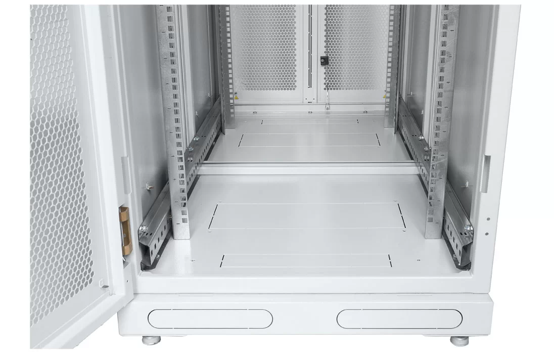 За счет элементов крепления каркас шкафа имеет повышенную жесткость. Распределенная вертикальная нагрузка до 1000 кг. Стандартно шкаф комплектуется: передней и задней дверями, боковыми стенками с замками.