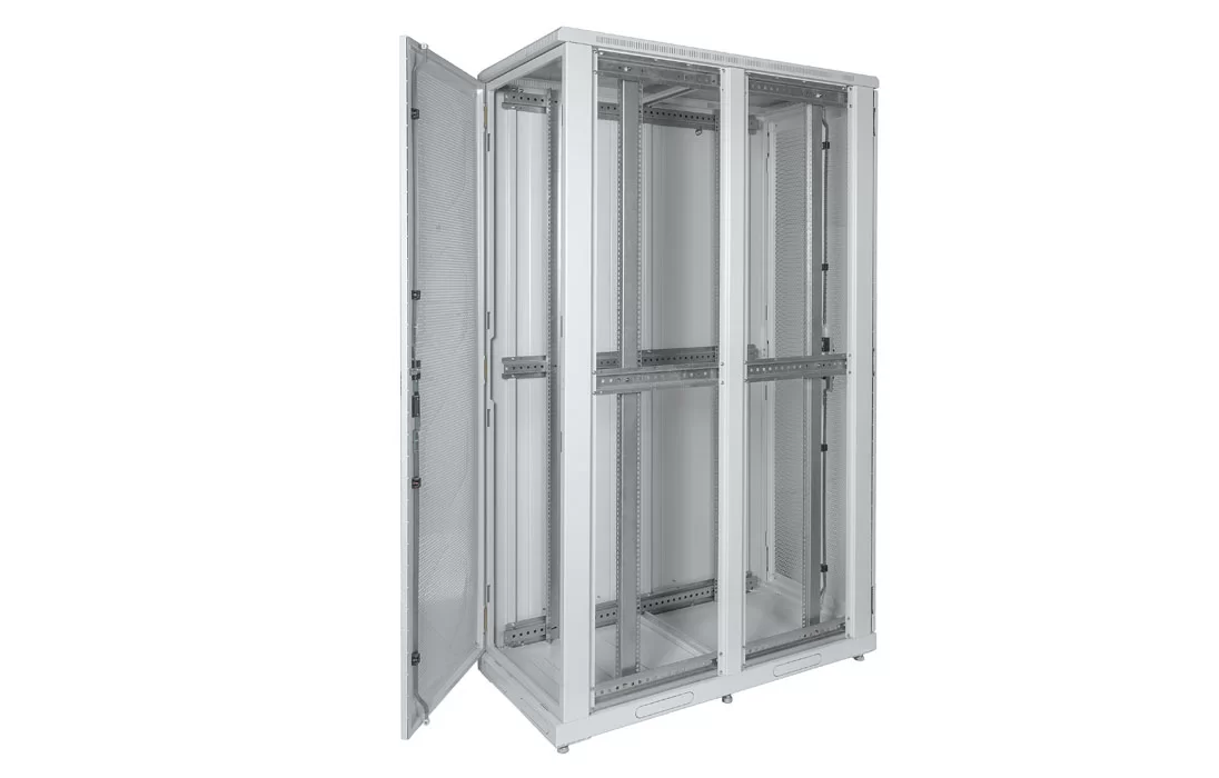 За счет элементов крепления каркас шкафа имеет повышенную жесткость. Распределенная вертикальная нагрузка до 1000 кг. Стандартно шкаф комплектуется: передней и задней дверями, боковыми стенками с замками.