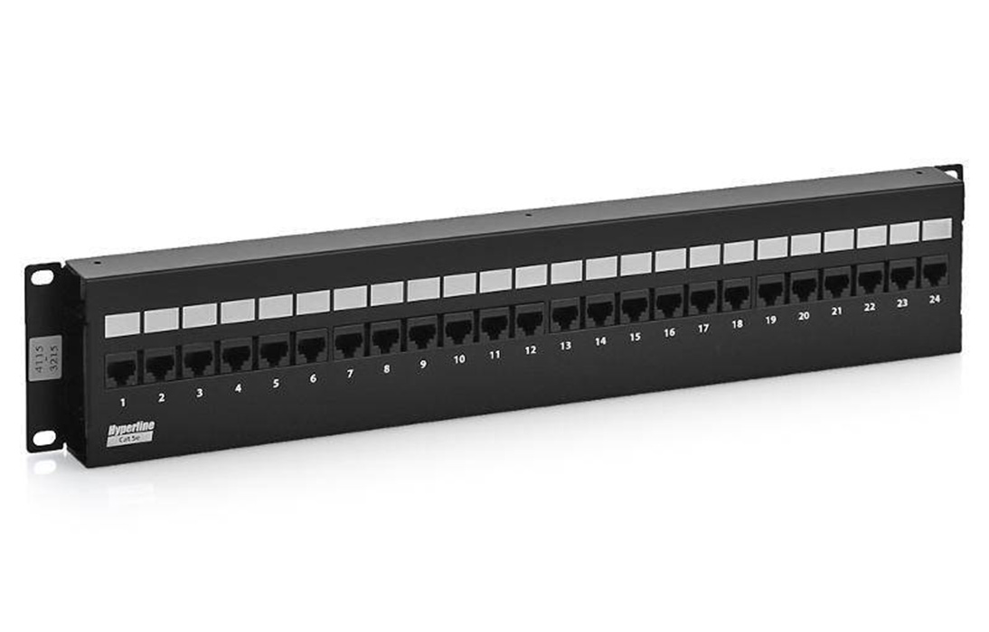 Представляет собой панель с множеством соединительных разъёмов – розеток RJ-45, расположенных на лицевой стороне панели и врезными контактами, расположенными на тыльной стороне панели, предназначенными для фиксированного соединения с витопарными кабелями.