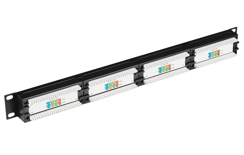 Представляет собой панель с множеством соединительных разъёмов – розеток RJ-45, расположенных на лицевой стороне панели и врезными контактами, расположенными на тыльной стороне панели, предназначенными для фиксированного соединения с витопарными кабелями.