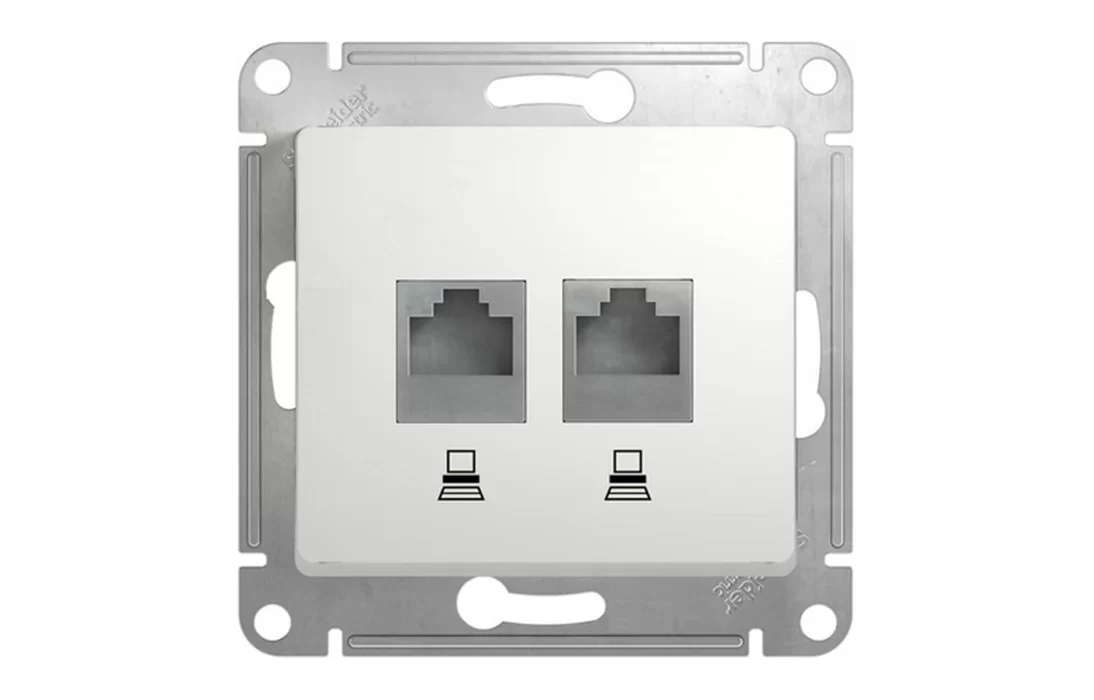 Механизм Schneider Electric Glossa (цвет белый) двойной розетки компьютерной с разъёмом RJ45 категория 5е предназначен для удобного и быстрого подключения вашего компьютера к компьютерной сети. Выполнен из материала PС+ASA, стойкого к УФ-излучению и появлению царапин.