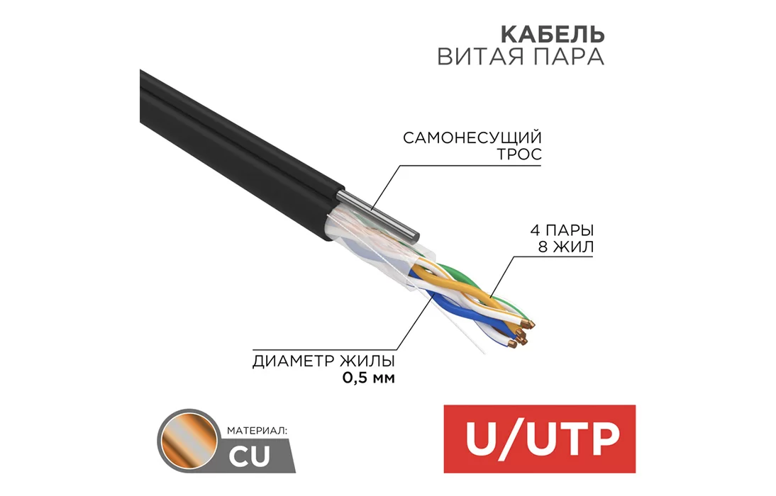 —01-0046 Кабель витая пара REXANT UTP 4PR 24AWG, CAT5e наружный (OUTDOOR) + ТРОС*1 (бухта 305 м)