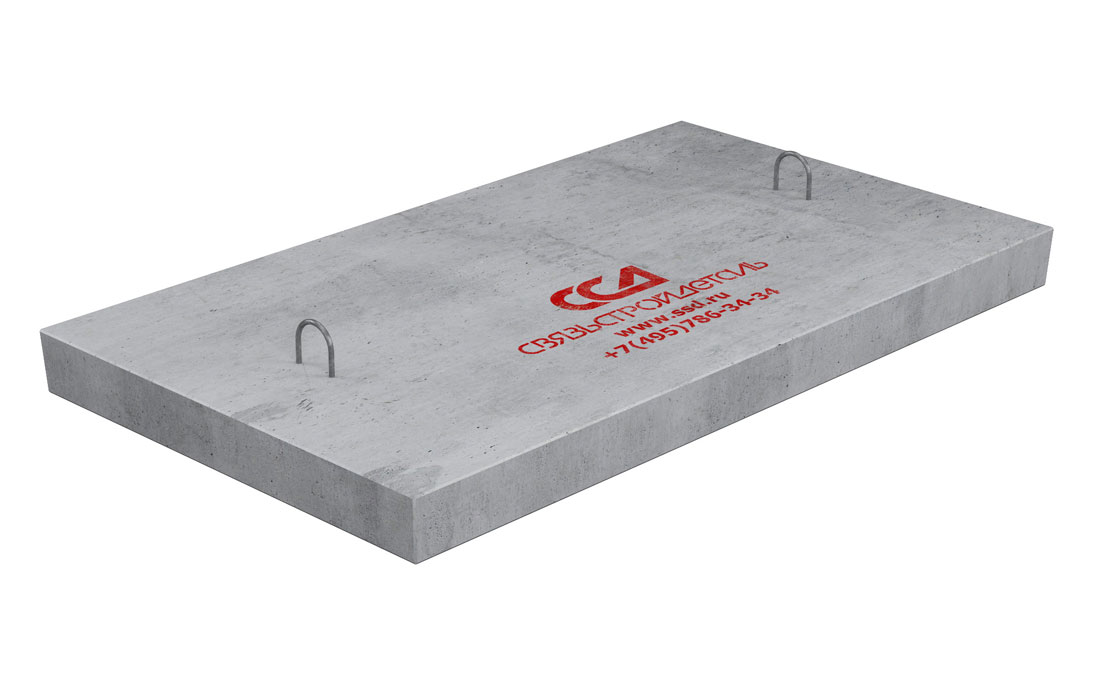 Плита имеет прямоугольную форму. На верхней поверхности плиты расположены две строповочных петли. После установки пластикового колодца на плиту, производят крепление колодца с помощью комплекта крепления.