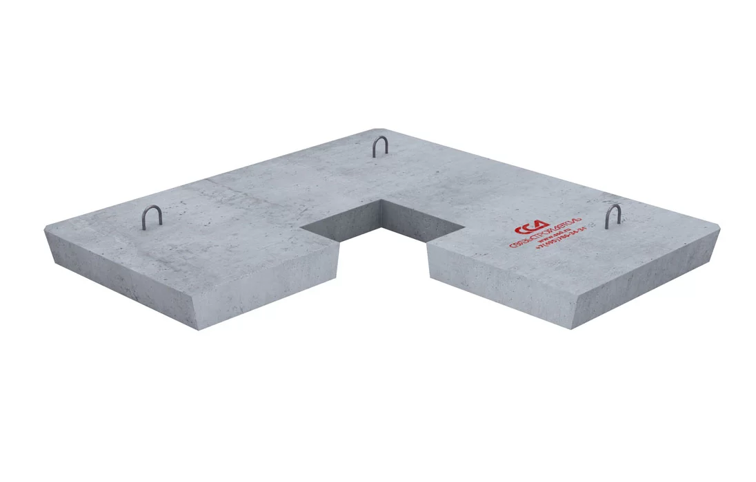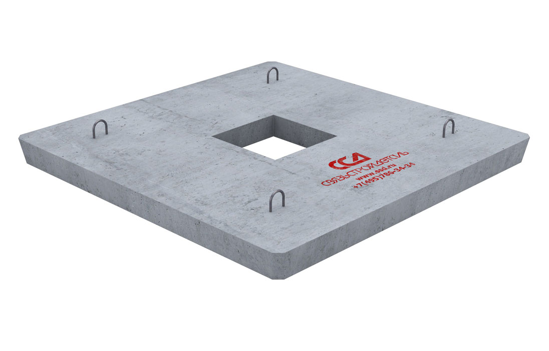 Плита имеет квадратную форму с центрально расположенным квадратным отверстием, для возможности применения обратного клапана в пластиковом колодце. На верхней поверхности плиты расположены четыре строповочных петли. После установки пластикового колодца на плиту, производят их крепление с помощью анкерных болтов.
