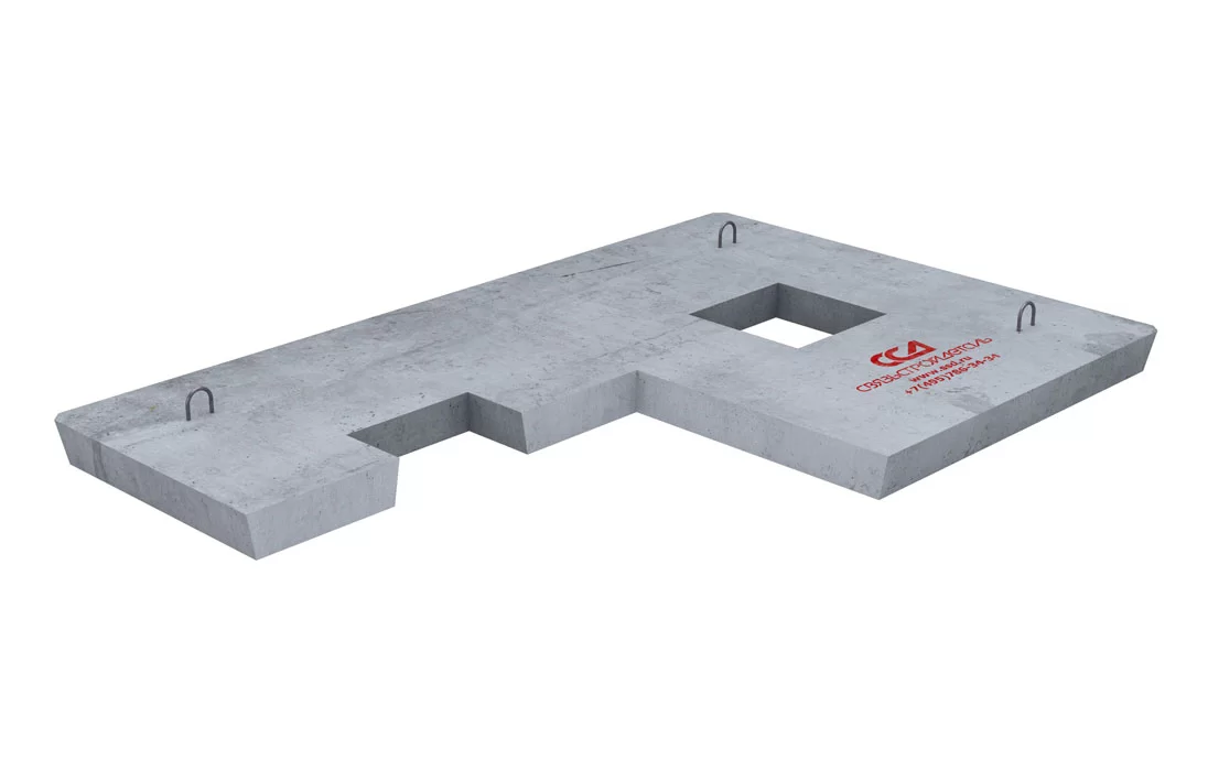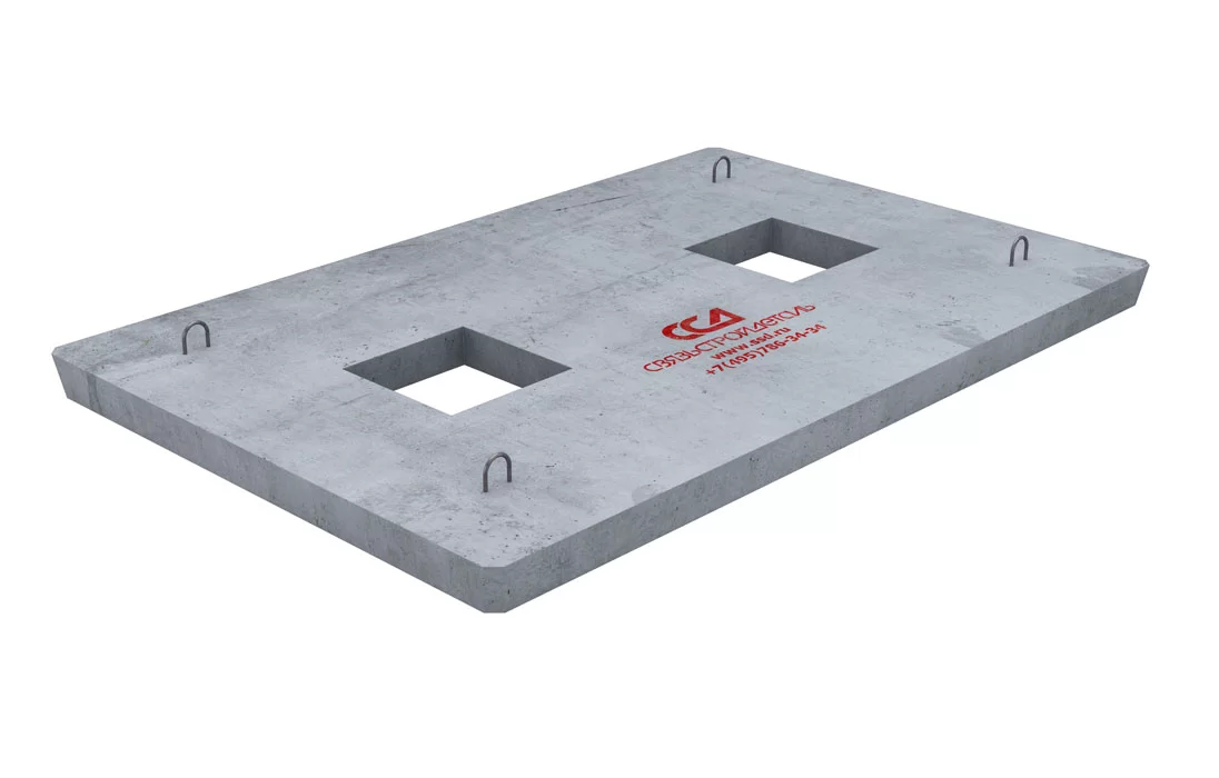 Плита имеет прямоугольную форму с центрально расположенными квадратными отверстиями, для возможности применения обратных клапанов в пластиковом колодце. На верхней поверхности плиты расположены четыре строповочных петли. После установки пластикового колодца на плиту, производят их крепление с помощью анкерных болтов.