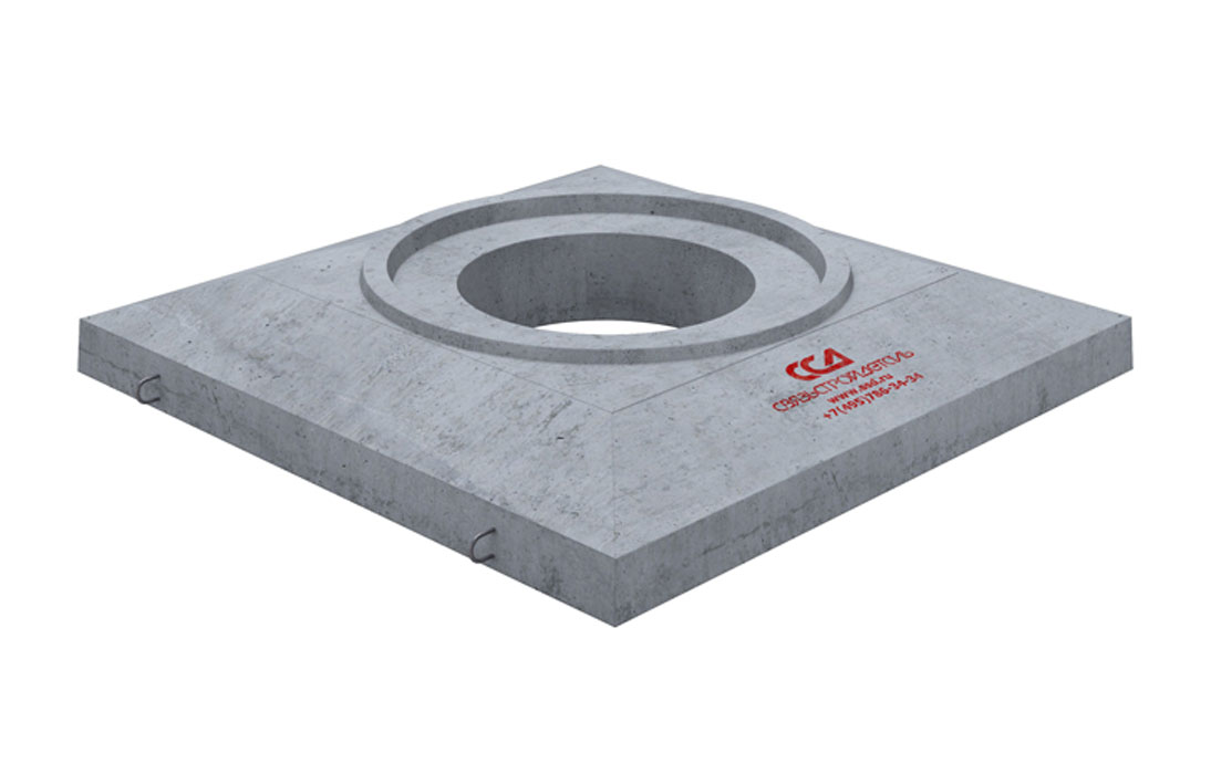 Плита предназначена для равномерного распределения нагрузки и применяется на колодцах типоразмера ККСр-1; ККСр-2; ККСр 2,5. Приложенная (точечная) нагрузка действующая на зону установки колодца равномерно перераспределяется по подошве разгрузочной плиты. Правильно рассчитанная площадь плиты, толщины, класса бетона, армирования обеспечивает надёжную работу при расчётных условиях монтажа и эксплуатации конструкции.