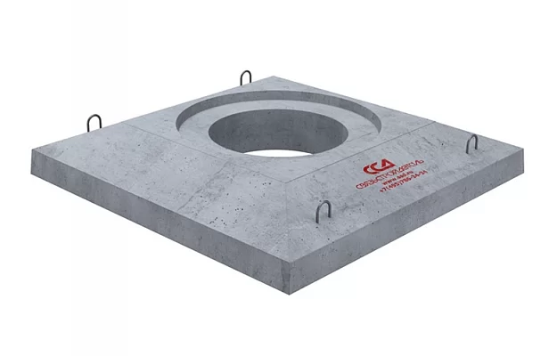 Плита предназначена для равномерного распределения нагрузки и применяется на колодцах типоразмера ККСр-1; ККСр-2; ККСр 2,5. Приложенная (точечная) нагрузка действующая на зону установки колодца равномерно перераспределяется по подошве разгрузочной плиты. Правильно рассчитанная площадь плиты, толщины, класса бетона, армирования обеспечивает надёжную работу при расчётных условиях монтажа и эксплуатации конструкции.