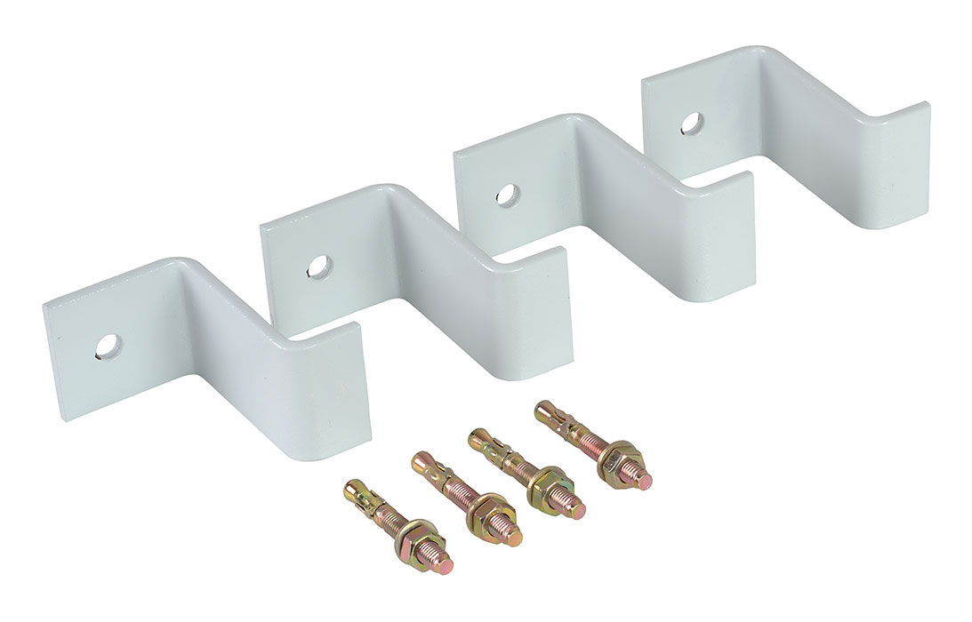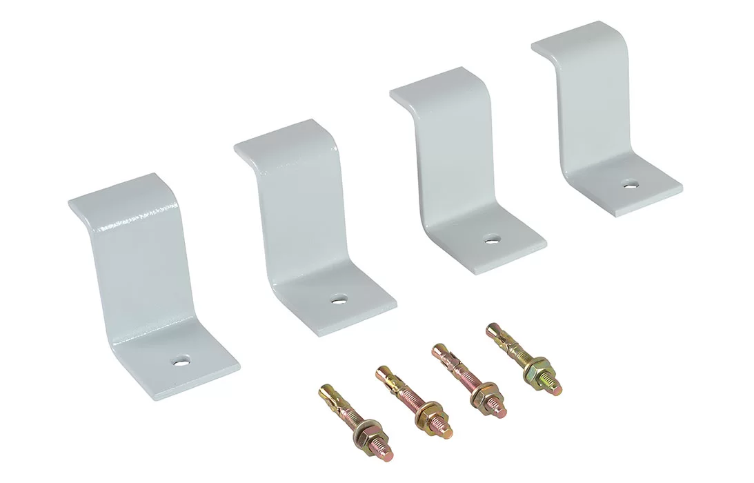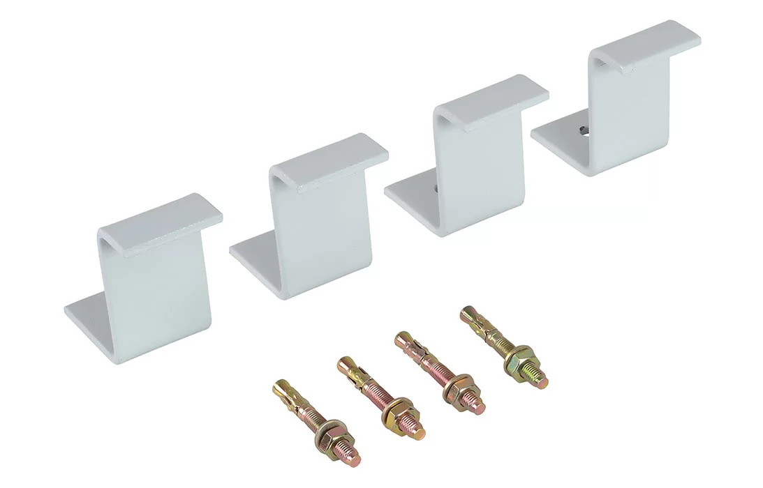 Комплект состоит из 4 металлических скоб с отверстиями, специальным образом изогнутых по форме дна камеры, а также 4 клиновых анкеров для фиксации КОТ-3 к основанию. Скобы покрыты порошковой краской.