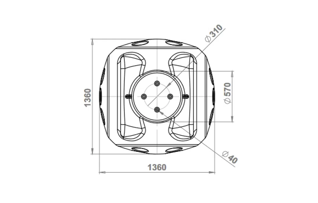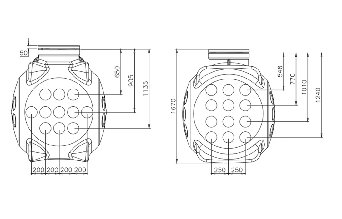 Представляет собой цельнолитое изделие шарообразной формы, без сварных швов, обеспечивающих его герметичность. Корпус колодца имеет ребра жесткости для придания ему повышенной прочности. С четырех сторон, на стенках колодца имеются специально сформированные контуры для ввода гладкостенных и гофрированных труб. Каждая стенка содержит по 6-ть таких контуров диаметром 170 мм.