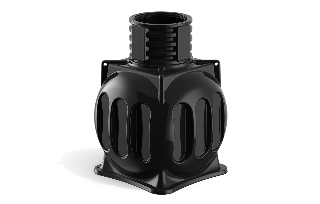 Представляет собой цельнолитое изделие шарообразной формы, с предустановленной горловиной. Горловина крепиться к корпусу колодца с помощью резьбового соединения. Для обеспечения прочности и герметичности соединения выполняется сварка. Корпус колодца имеет ребра жесткости для придания ему повышенной прочности. С четырех сторон, на стенках колодца имеются специально сформированные контуры для ввода гладкостенных, гофрированных и спиральновитых (ССД-Пайп) труб. Каждая стенка содержит по 3 таких контура размером 210х710 мм.