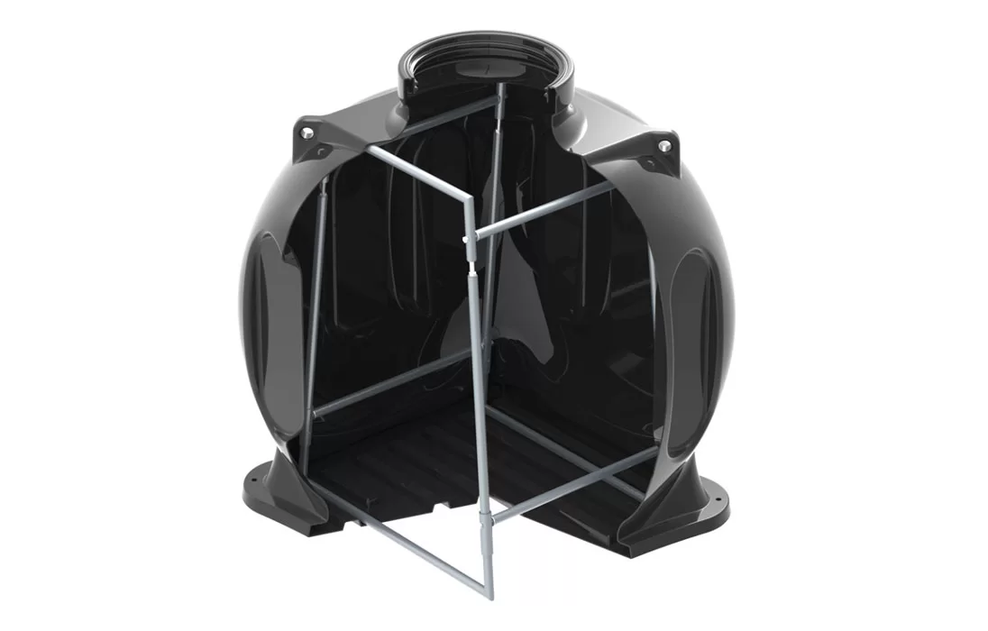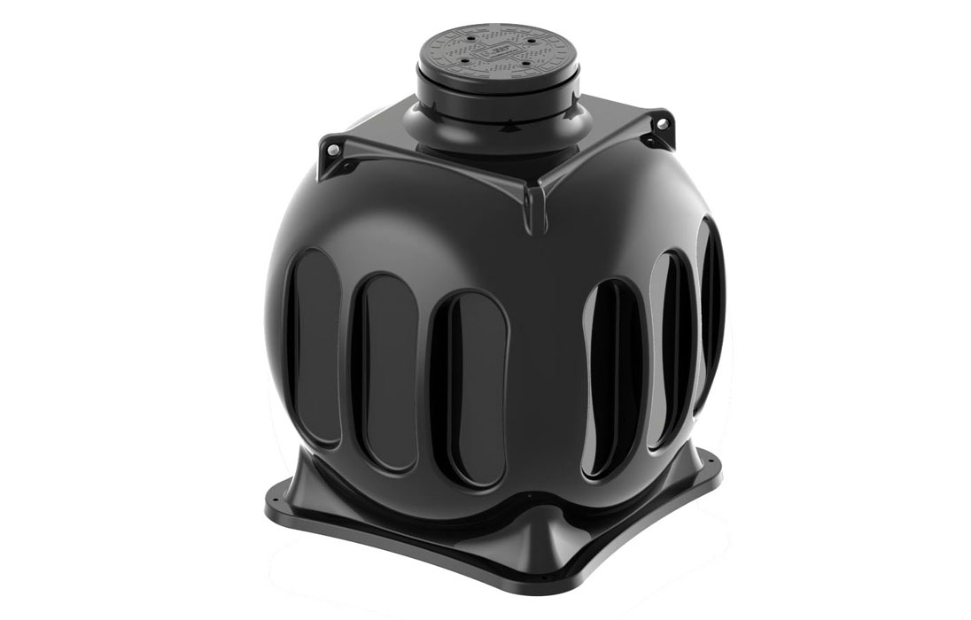 Представляет собой цельнолитое изделие шарообразной формы, без сварных швов, которое усилено металлическим каркасом, установленным внутри камеры колодца. Корпус колодца имеет ребра жесткости для придания ему повышенной прочности. С четырех сторон, на стенках колодца имеются специально сформированные контуры для ввода гладкостенных, гофрированных и спиральновитых (ССД-Пайп) труб. Каждая стенка содержит по 3 таких контура размером 210х710 мм.