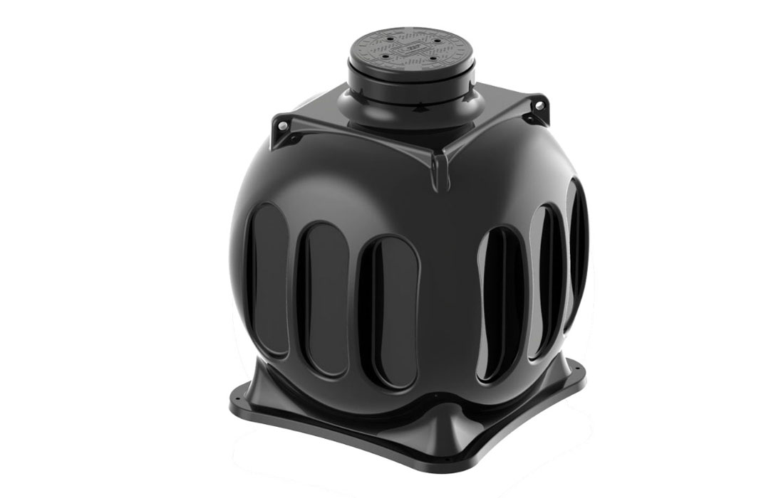 Представляет собой цельнолитое изделие шарообразной формы, без сварных швов. Корпус колодца имеет ребра жесткости для придания ему повышенной прочности. С четырех сторон, на стенках колодца имеются специально сформированные контуры для ввода гладкостенных, гофрированных и спиральновитых (ССД-Пайп) труб. Каждая стенка содержит по 3 таких контура размером 210х710 мм.