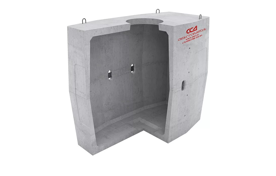 Колодец имеет в сечении восьмиугольную форму и состоит из двух элементов – верхней и нижней половин. Перекрытие верхнего элемента дополнительно армировано и содержит круглое отверстие диаметром 600 мм для формирования горловины с люков. В основании корпуса колодца с внутренней стороны расположена прямоугольная ниша. При необходимости, ее стенку вырезают для создания дренажа. На наружных поверхностях торцевых и боковых стен расположены глухие ниши, в пределах которых монтируются муфты ССД-Пайп (количество и диаметр труб определяется согласно опросному листу). На торцевых поверхностях корпуса колодца имеются петли для строповки при его погрузке и разгрузке с автомобиля, а также для опускания в котлован.