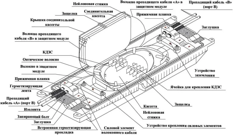 Волоконно-оптический кабель вводится в муфту и фиксируется на её основании с помощью прижимной планки. Аналогичные действия выполняются и с силовым элементом, который помещается в фиксирующий разъём и закрепляется обычной гайкой.