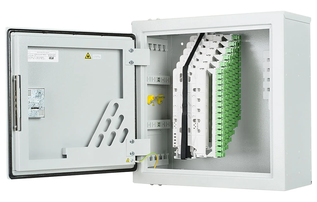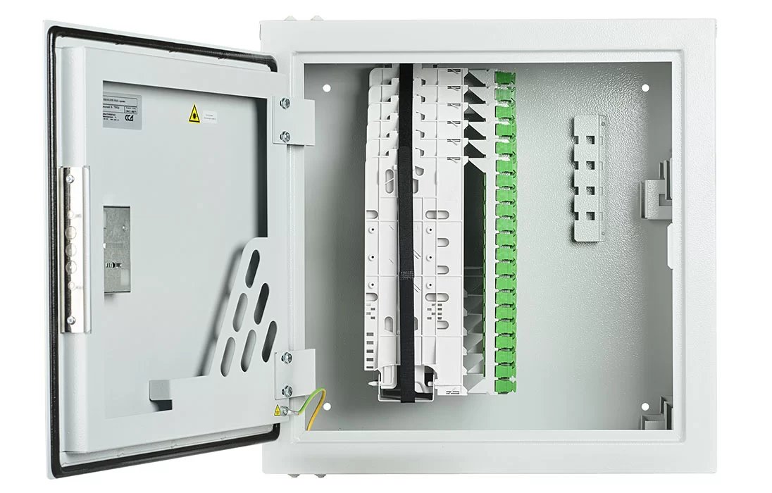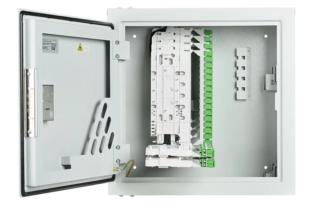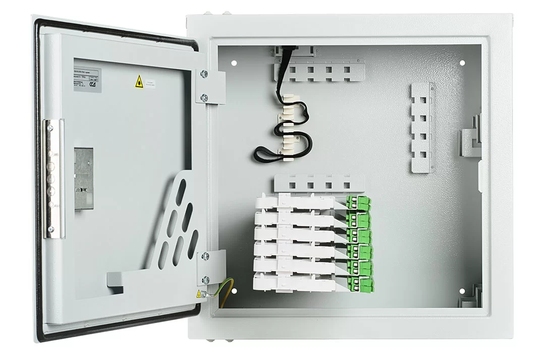 В шкафу предусмотрены несколько монтажных зон. В зоне ввода оптические кабели разделываются и фиксируются. Далее волокна в транспортных трубках поступают в зону монтажа на соответствующий кроссовый модуль. Планарные оптические разветвители устанавливаются в специальные контейнеры на правой боковой стенке шкафа.