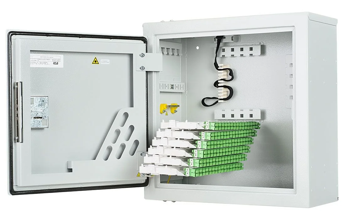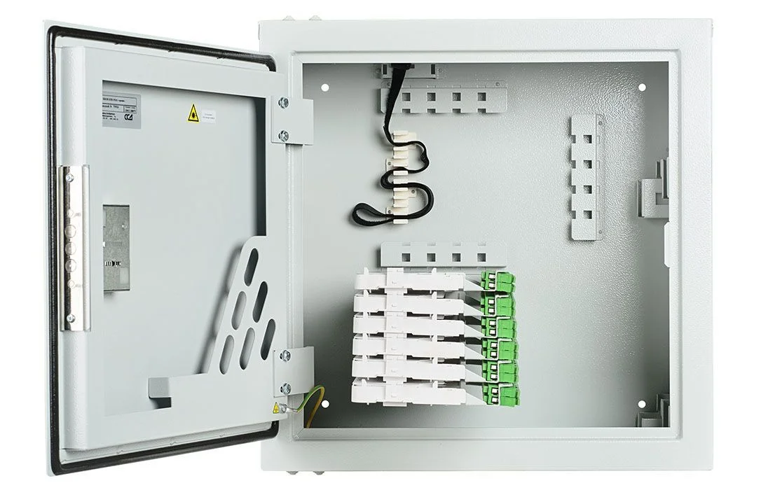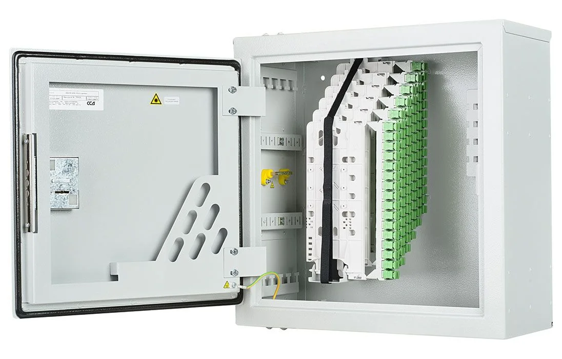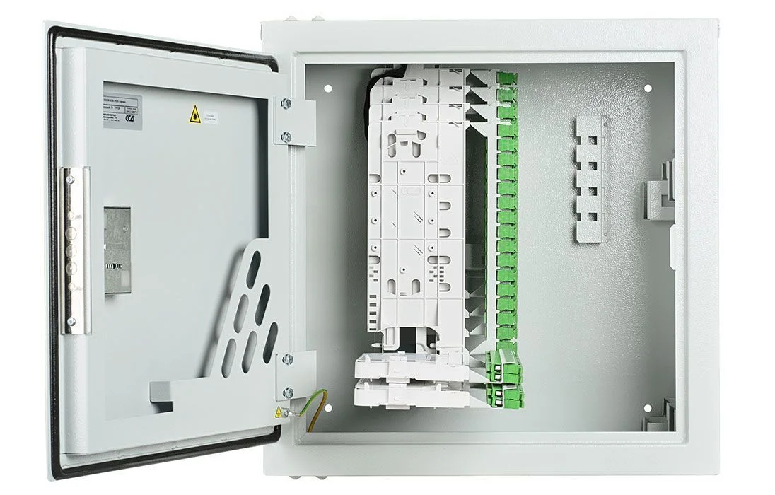В шкафу предусмотрены несколько монтажных зон. В зоне ввода оптические кабели разделываются и фиксируются. Далее волокна в транспортных трубках поступают в зону монтажа на соответствующий кроссовый модуль. Планарные оптические разветвители устанавливаются в специальные контейнеры на правой боковой стенке шкафа. В закрытом положении кроссовые модули защелкиваются один за другой.