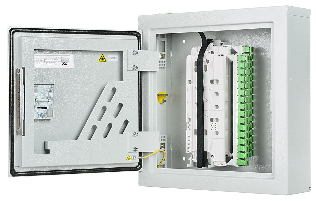 В шкафу предусмотрены несколько монтажных зон. В зоне ввода оптические кабели разделываются и фиксируются. Далее волокна в транспортных трубках поступают в зону монтажа на соответствующий кроссовый модуль. Планарные оптические разветвители устанавливаются в специальные контейнеры на правой боковой стенке шкафа.