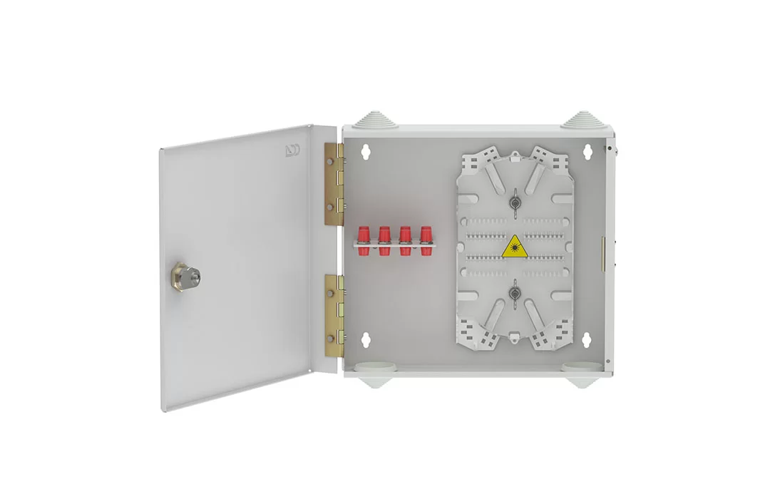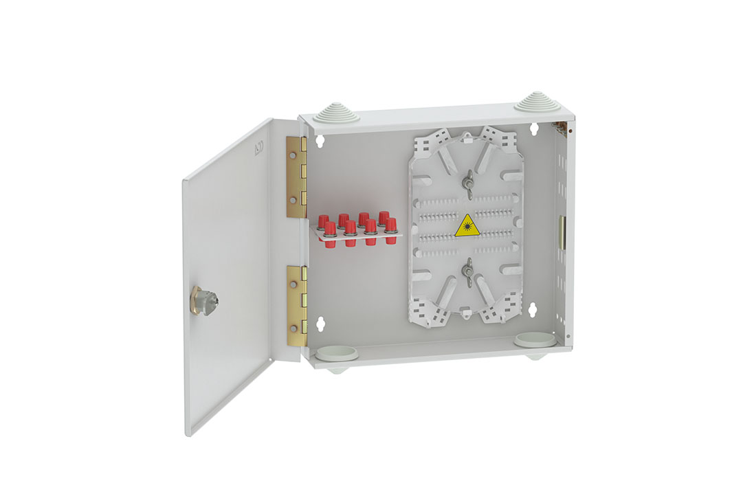 Оптические кабели разделываются и фиксируются в зоне ввода. Далее волокна в модулях поступают на кассеты для сварки с пигтейлами.