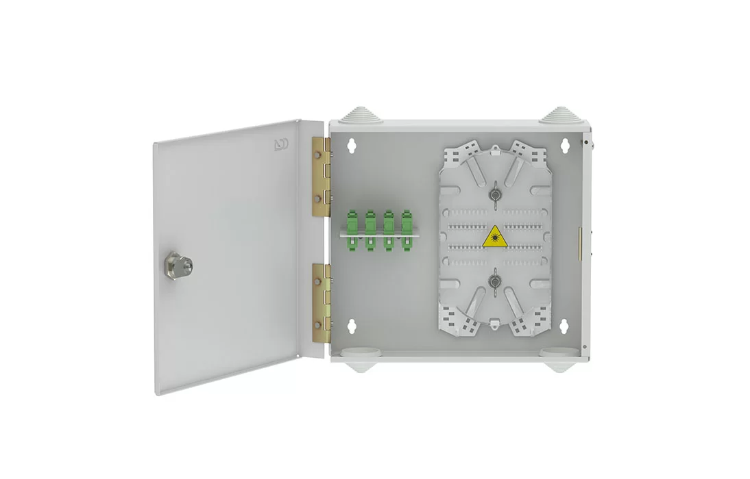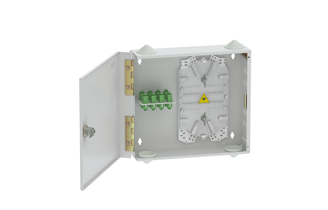 Оптические кабели разделываются и фиксируются в зоне ввода. Далее волокна в модулях поступают на кассету для сварки с пигтейлами.