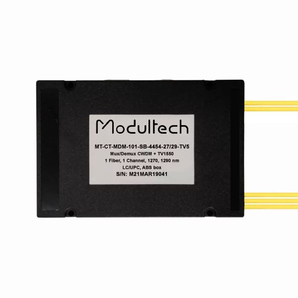 Мультиплексор MT-CT-MDM-101-SB-4454-27/29-TV5 производства компании Modultech представляет собой пассивное мультиплексирующее (суммирующее) оборудование для одновременной передачи сигналов CWDM и широкополосных КТВ сигналов в форм-факторе ABS box. Используется для одновременного мультиплексирования (объединения) одного канального CWDM сигнала + один широкополосный сигнал 1550 ± 40 нм и демультиплексирования (разделения).