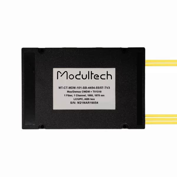 Мультиплексор MT-CT-MDM-101-SB-4454-55/57-TV3 производства компании Modultech представляет собой пассивное мультиплексирующее (суммирующее) оборудование для одновременной передачи сигналов CWDM и широкополосных КТВ сигналов в форм-факторе ABS box. Используется для одновременного мультиплексирования (объединения) одного канального CWDM сигнала + один широкополосный сигнал 1310 ± 40 нм и демультиплексирования (разделения).