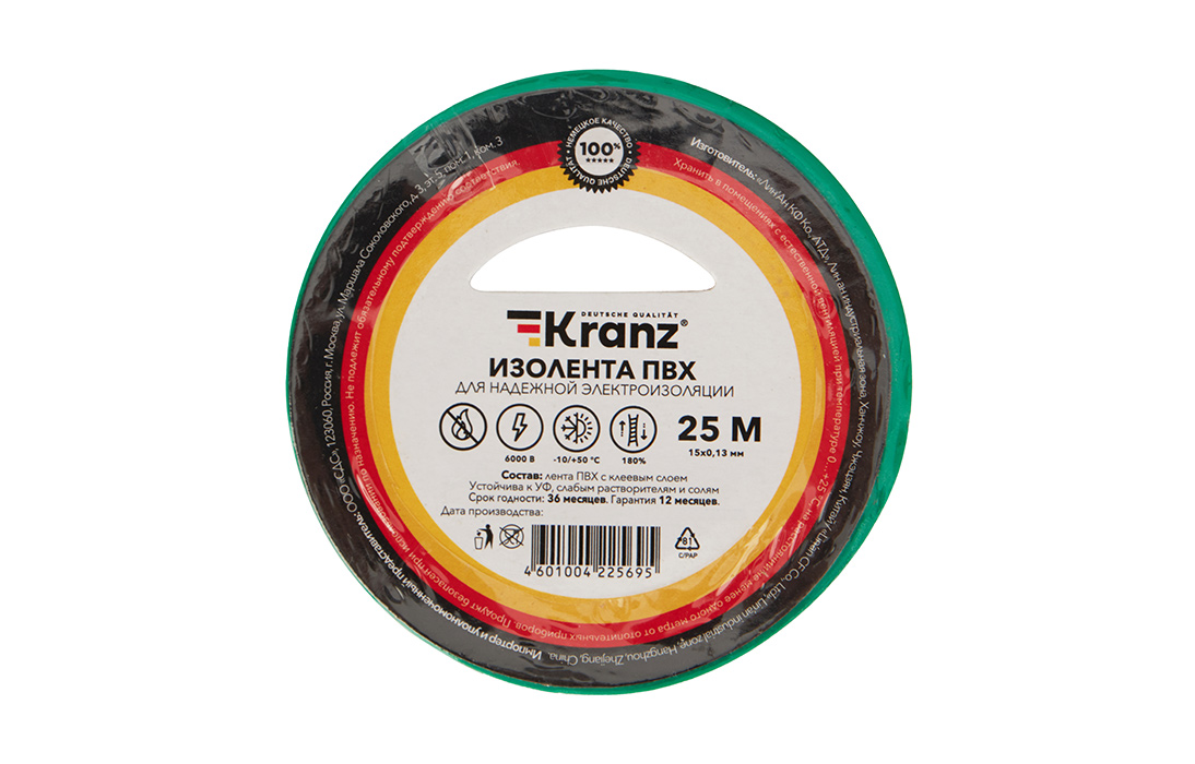 Изолента KRANZ предназначена для электрической изоляции, цветной маркировки, соединения, защиты от внешних факторов и герметизации кабелей, проводов и шнуров.