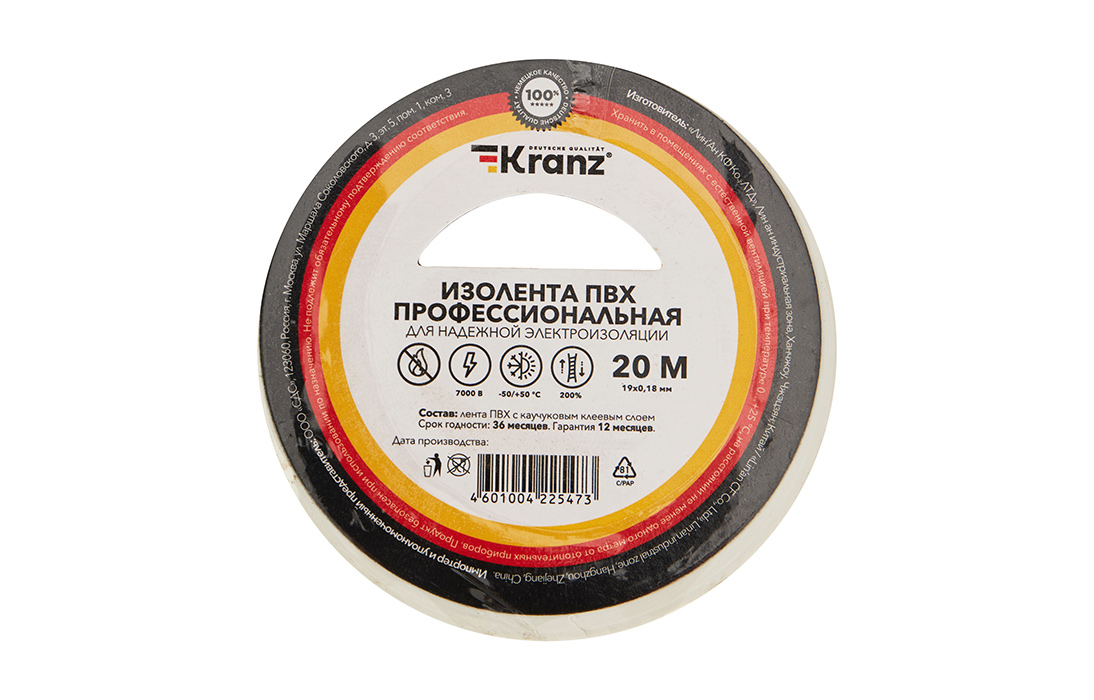 Профессиональная изоляционная лента KRANZ класса PREMIUM используется для электрической изоляции, цветной маркировки, соединения, защиты от внешних факторов и герметизации кабелей, проводов и шнуров.