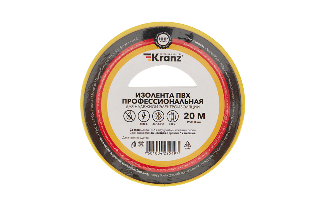 Профессиональная изоляционная лента KRANZ класса PREMIUM используется для электрической изоляции, цветной маркировки, соединения, защиты от внешних факторов и герметизации кабелей, проводов и шнуров.