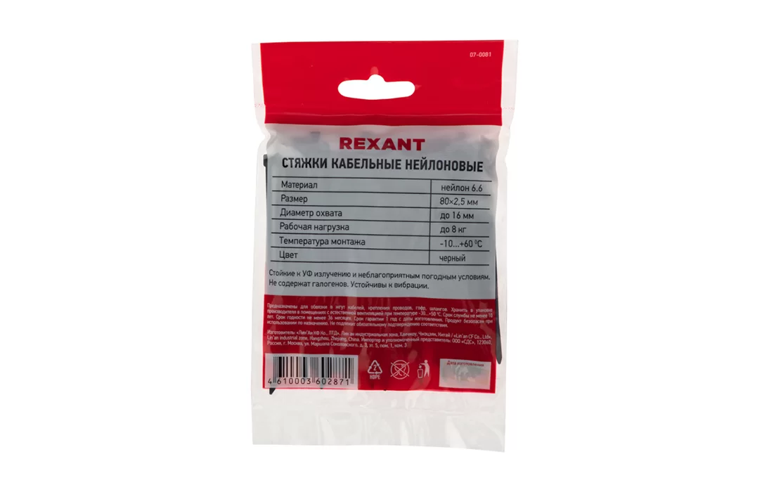 07-0081 Хомут-стяжка кабельная нейлоновая REXANT 80 x2,5 мм, черная, упаковка 100 шт.