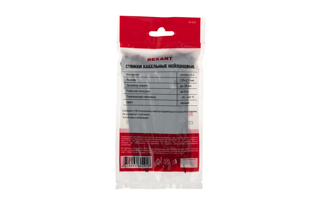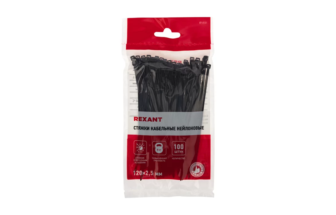 07-0121 Хомут-стяжка кабельная нейлоновая REXANT 120 x2,5 мм, черная, упаковка 100 шт.