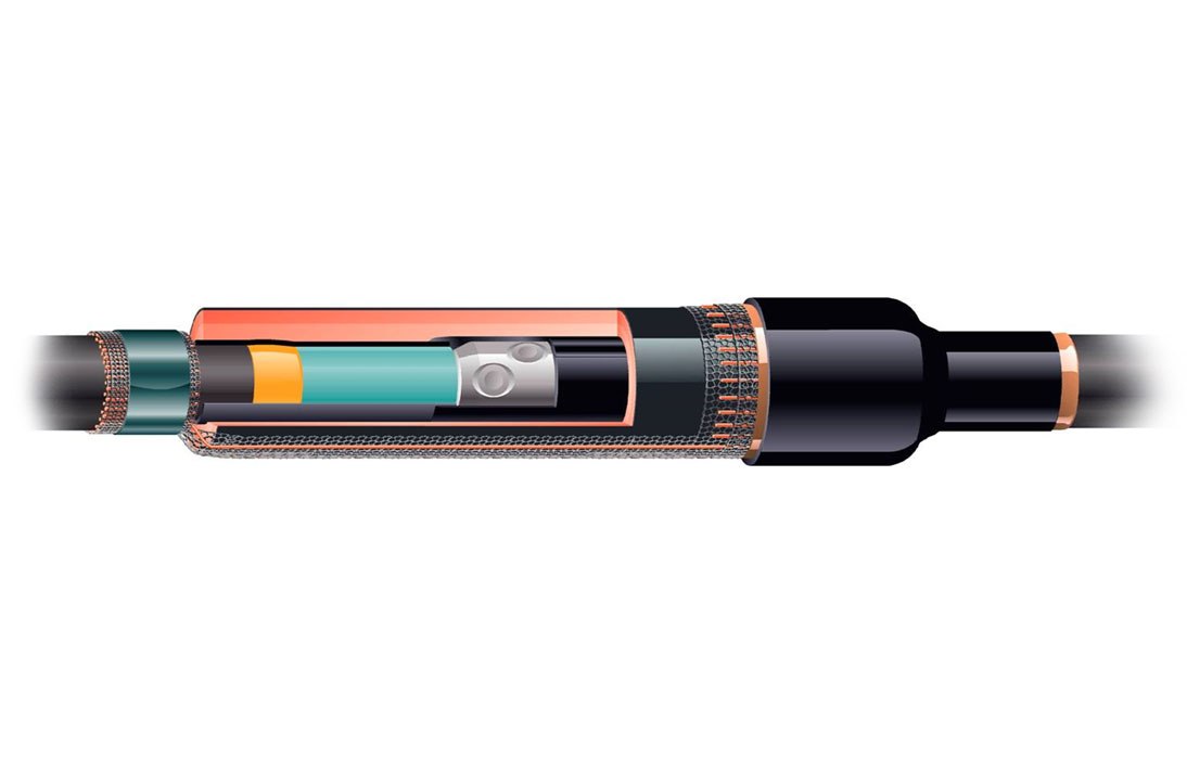 Место среза экрана подматывается желтой лентой заполнения пустот, и затем на это место усаживается термоусаживаемая трубка, выравнивающая напряженность электрического поля. Жилы соединяются механическими соединителями, поставляемыми комплектно. Область соединителей оборачивается мастичной пластиной для выравнивания напряженности поля. Затем надвигается термоусаживаемая двухслойная эластомерная трубка, обеспечивающая равномерную толщину изоляции и создавая экран в месте соединения. Медная сетка оборачивается вокруг места соединения и восстанавливает металлический экран. Для кабелей с проволочным экраном комплект включает систему соединения экранов. Для кабелей с ленточным экраном в комплект муфты входит система непаянного заземления, которая также применима для кабелей с алюминиевым ламинированным экраном типа AHXAMK-W (кабели типа NK). Внешняя герметизация и защита обеспечивается толстостенной термоусаживаемой трубкой.