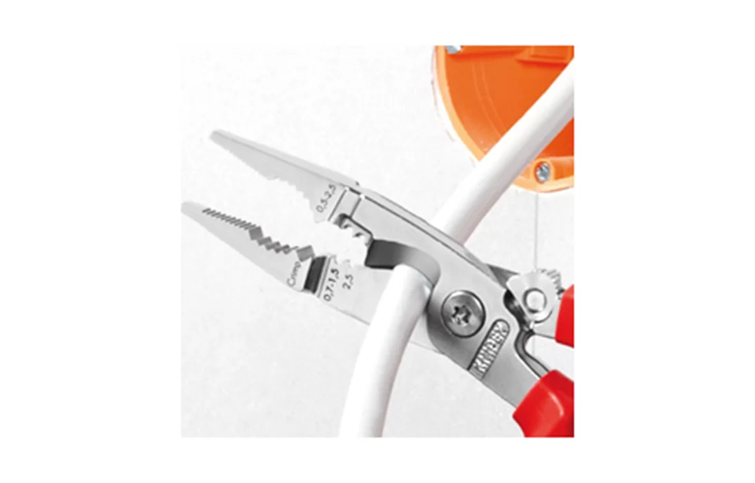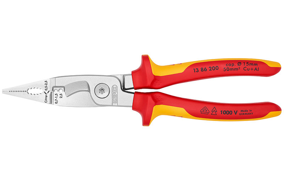 13 86 200 Электромонтажные клещи 6 функций в одних клещах. Mногофункциональные клещи для электромонтажных работ; для захвата плоского и круглого материала, гибки, удаления заусенцев, резки кабеля, удаления изоляции и опрессовки контактных гильз. Гладкие губки для захвата отдельных жил без их повреждения; профилированные губки и выемка для захвата плоского и круглого материала. Специальная наружная кромка на губке для обработки штепсельных розеток для скрытой проводки и удаления заусенцев на отверстиях для ввода кабеля. Удаление изоляции с проводов 0,75 – 1,5 мм² и 2,5 мм². Опрессовочное гнездо для контактных гильз 0,5 – 2,5 мм². Ножницы с прецизионными лезвиями (индуктивной закалки) для резки медного и алюминиевого кабеля до 5 x 2,5 мм² / Ø 15 мм. Узкая конструкция рабочей части облегчает доступ к детали. Винтовой шарнир: точный ход без люфта. Безопасность, проверенная VDE (Союз немецких электриков), до 1000В. - Параметры режима резки: медный кабель, многопроводный: Ø 15mm