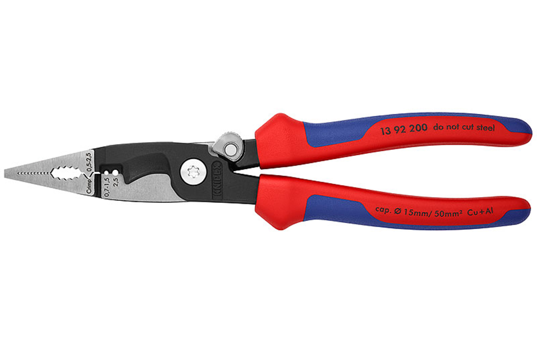 13 92 200 Электромонтажные клещи 6 функций в одних клещах. Mногофункциональные клещи для электромонтажных работ; для захвата плоского и круглого материала, гибки, удаления заусенцев, резки кабеля, удаления изоляции и опрессовки контактных гильз. Гладкие губки для захвата отдельных жил без их повреждения; профилированные губки и выемка для захвата плоского и круглого материала. Специальная наружная кромка на губке для обработки штепсельных розеток для скрытой проводки и удаления заусенцев на отверстиях для ввода кабеля. Удаление изоляции с проводов 0,75 – 1,5 мм² и 2,5 мм². Опрессовочное гнездо для контактных гильз 0,5 – 2,5 мм². Ножницы с прецизионными лезвиями (индуктивной закалки) для резки медного и алюминиевого кабеля до 5 x 2,5 мм² / Ø 15 мм. Узкая конструкция рабочей части облегчает доступ к детали. Винтовой шарнир: точный ход без люфта. В моделях с разжимающей пружиной закрытие защёлки приводит к смыканию лезвий, но не блокирует другие функции, благодаря рациональному механизму