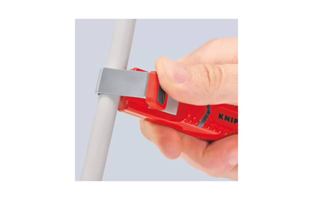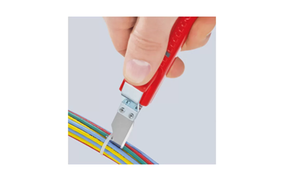 16 20 165 SB Стриппер для удаления оболочек всех распространенных круглых кабелей. Конструкция имеет самораскрывающуюся упорную скобу, настройку глубины резания установочным винтом, вращающееся лезвие для резов по окружности и продольных резов, сменное лезвие в корпусе инструмента, надежное удержание благодаря мягким вставкам на ручках и на фиксаторе, предотвращающим скольжение руки, нож с прямым лезвием и лезвием-крючком. Инструмент имеет диапазон рабочих диаметров от Ø 8,0 до 28,0mm