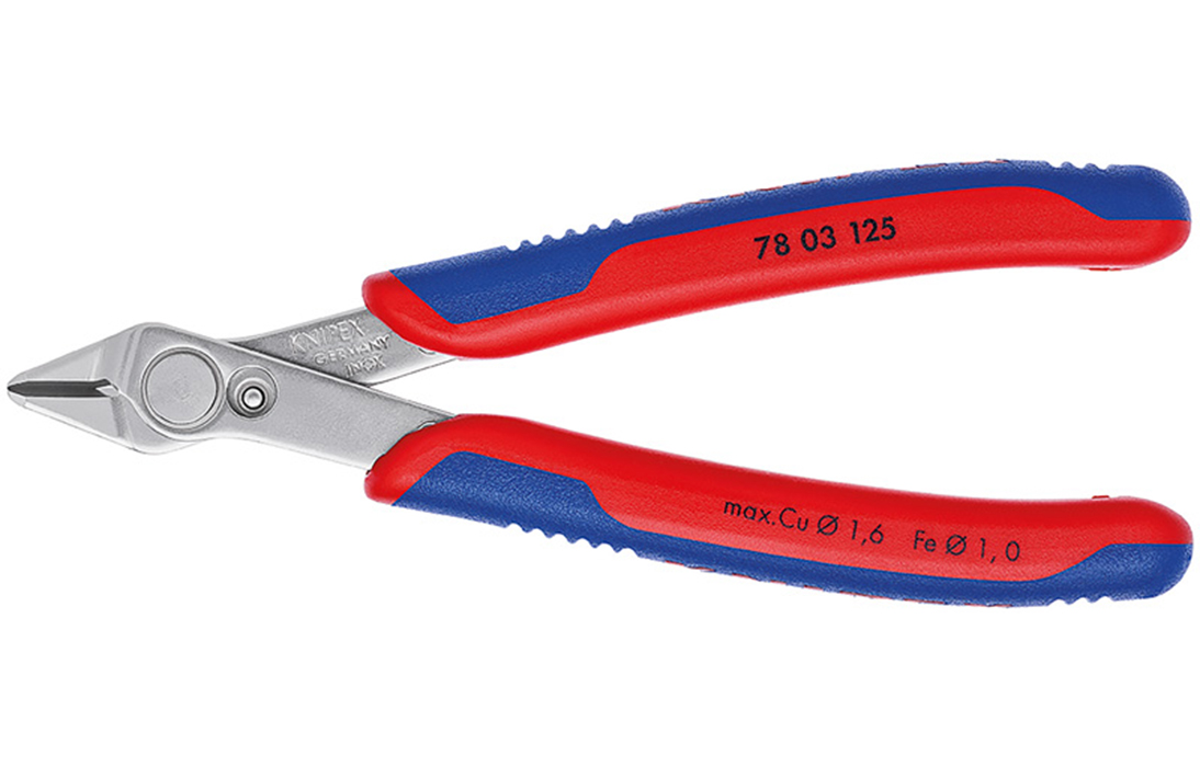 78 03 125 Electronic Super Knips® кусачки прецизионные для самых тонких работ по резанию, например, в электронике и точной механике. Шлифованные, очень острые режущие кромки без фасок. Прецизионные кончики режут заподлицо проволоку диаметром от 0,2 мм. Рез с контролируемым смещением режущей кромки – для увеличения срока службы и высокоточной резки самых тонких проводов. Шарнир с заклепкой из легированной стали. Исключительно легкий ход для работы с минимальным утомлением. С раскрывающей пружиной и ограничителем раскрытия. Твёрдость режущих кромок примерно 54 HRC. INOX - инструментальная сталь.