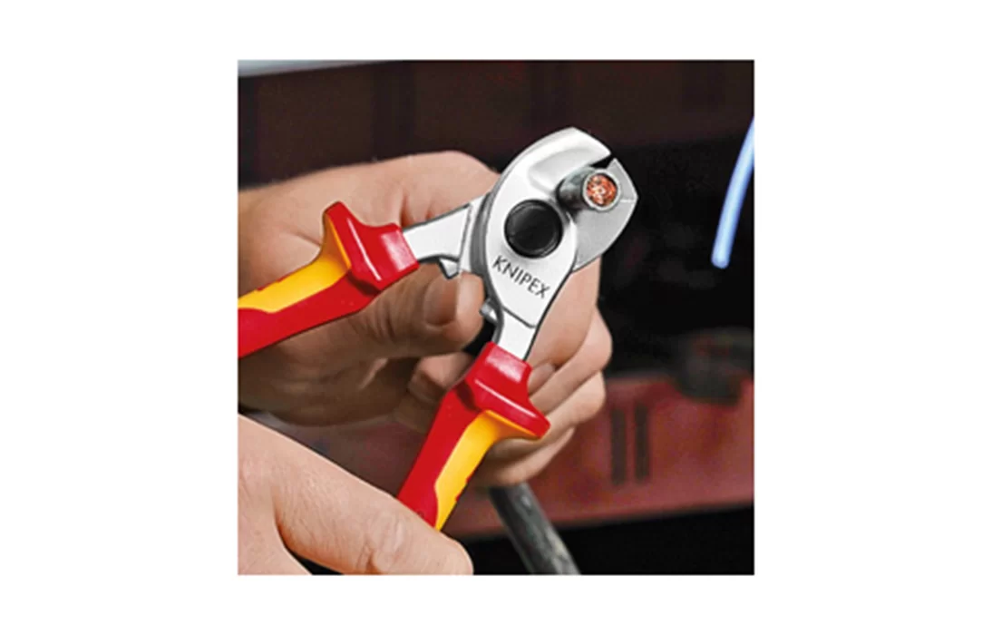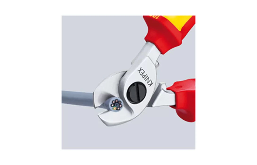95 26 165 Кабелерез для реза медного и алюминиевого кабеля, одно- и многожильного. Режут гладко и чисто, без деформации материала. Не подходит для стальной проволоки и твёрдотянутых медных проводников. Закаленные режущие кромки с прецизионной шлифовкой. Легко резать одной рукой. С защитой для рук. Регулируемый шарнир, винтовой, самофиксирующийся. Внутренняя пружина, защищенная от загрязнения или ее утери.