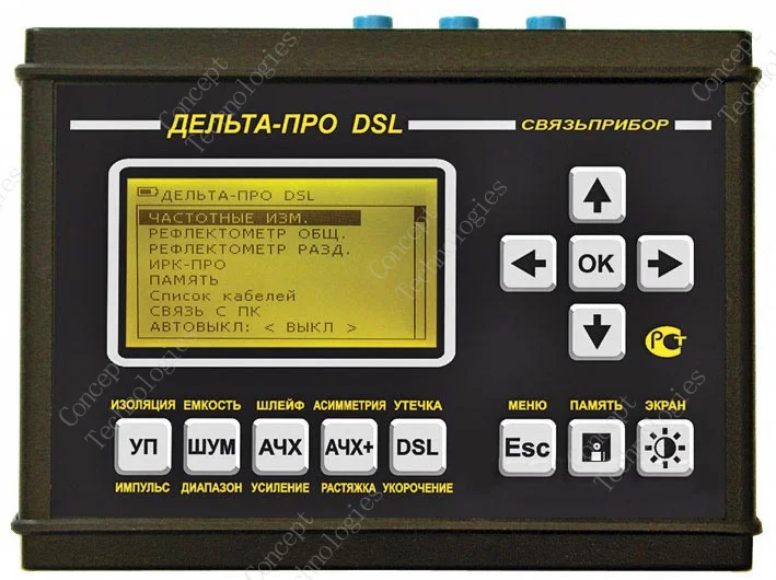 Измеритель параметров кабельных линий Дельта-ПРО DSL предназначен для измерения в полевых и стационарных условиях параметров симметричных кабелей связи. Диагностика и поиск неисправности. Измерения скоростного потенциала линии, анализ потерь скорости, частотные измерения, спектральный анализ помех и полезного сигнала, мониторинг помех за сутки, рефлектометр, мост. Встроенный модем Annex A+B: работа с DSLAM, определение стандарта, получение данных о скорости, оценка качества ADSL-линии; длительный мониторинг.