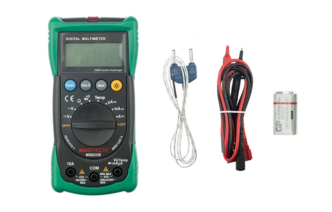 Мультиметр — электроизмерительный прибор, который включает в себя несколько функций и набор измеряемых параметров. Все приборы серии MS8233 измеряют постоянное и переменное напряжение, а также постоянный и переменный ток, сопротивление в цепи и даже температуру. С помощью данного прибора можно проводить тестирование диодов и осуществлять прозвонку целостности цепи. Мультиметр MS8233E оборудован специальным датчиком, с помощью которого вы бесконтактно сможете определить, есть ли напряжение на участке, например в розетке, если есть необходимость демонтировать ее, то с помощью данного мультиметра вы сможете сразу узнать, если ли в ней напряжение. Таким образом, один прибор сможет заменить сразу несколько устройств одновременно.