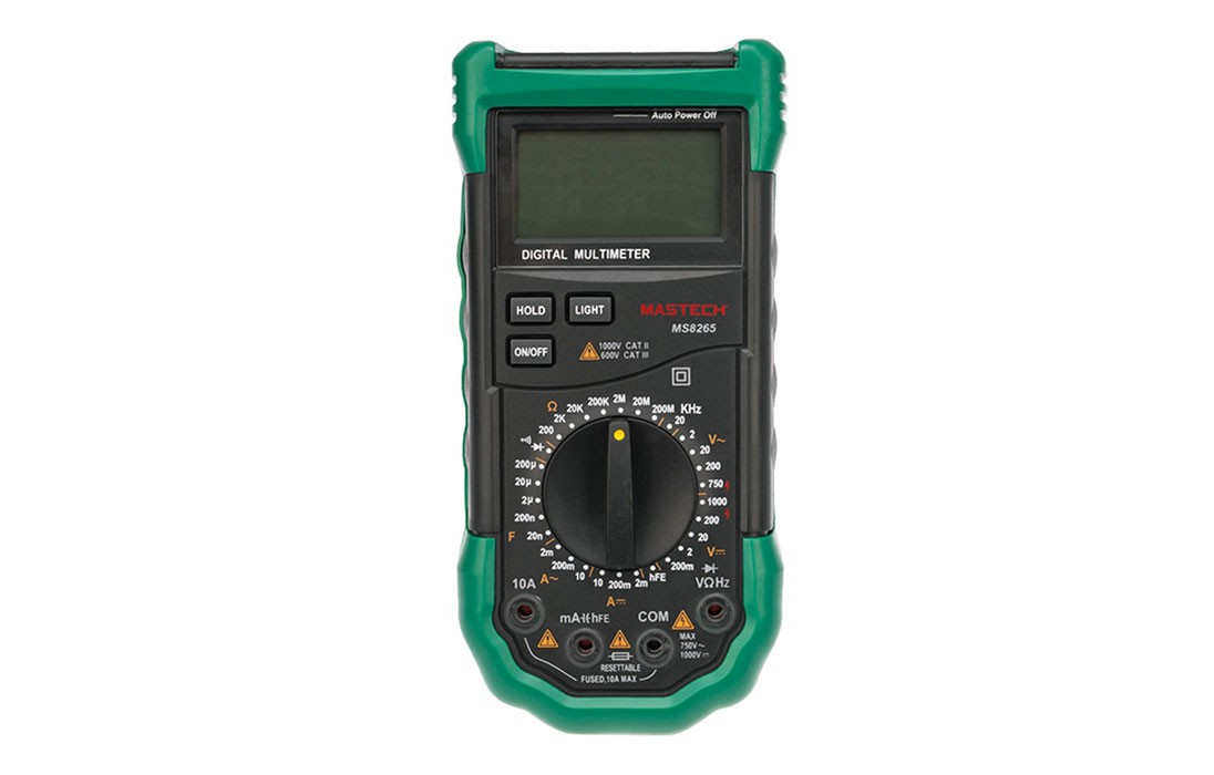 Современный цифровой мультиметр MASTECH MS8265 c большим пятиразрядным LCD дисплеем позволяет измерять силу переменного и постоянного тока, постоянного и переменного напряжения, сопротивление, емкость конденсаторов, частоту сигнала и коэффициент усиления биполярных транзисторов. Большой 4½ разрядный ЖК-дисплей c подсветкой (максимальное индицируемое значение 19999) показывает также единицы измерения, что позволяет уменьшить вероятность ошибки. Ручной выбор пределов измерения, функция DATA HOLD, возможность прозвонки и теста диодов, самовосстанавливающийся предохранитель, делают мультиметр MS8265 (MASTECH) проcтым и надежным средством контроля электрических параметров на производстве и дома.